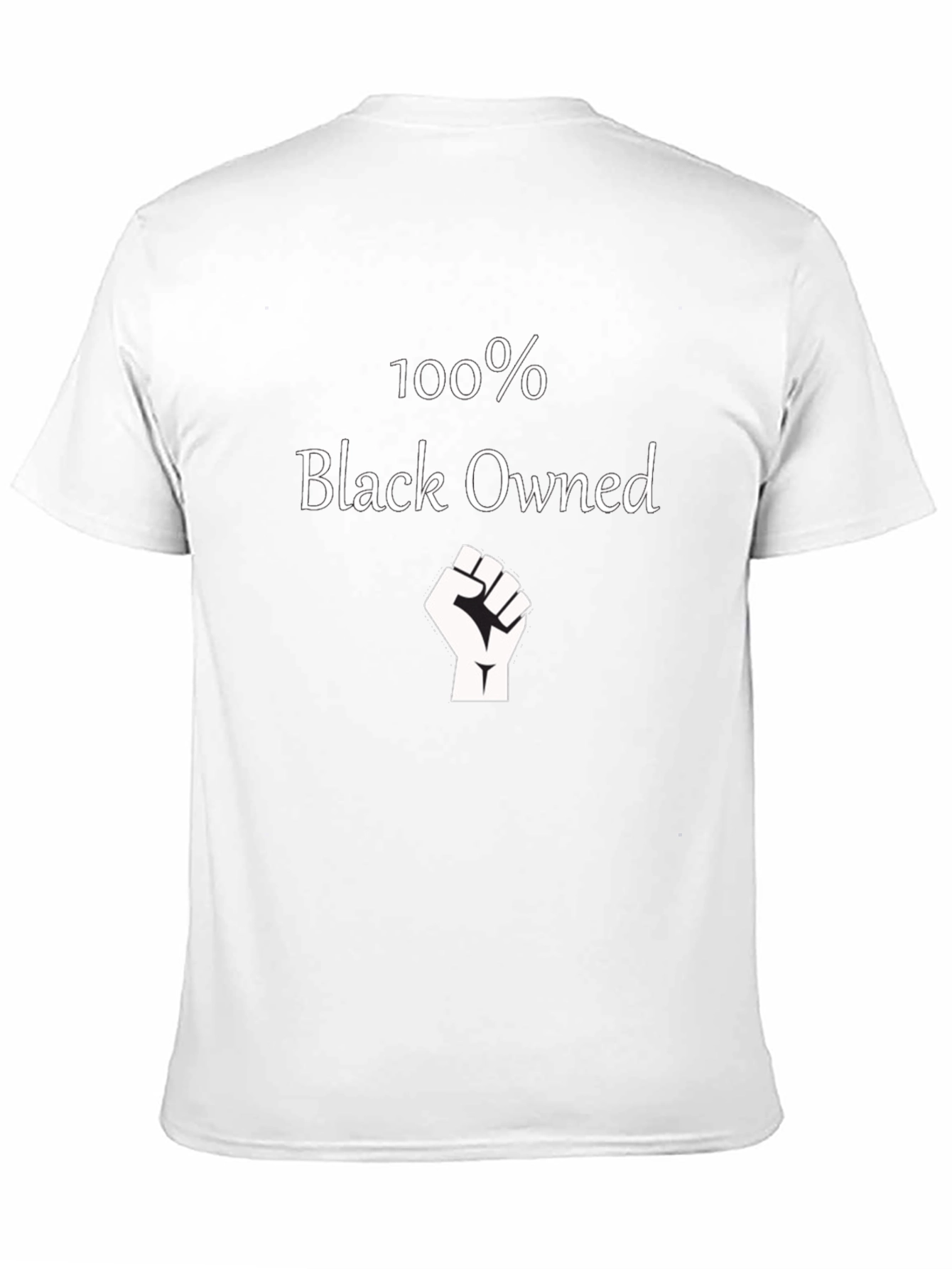 Show your pride and support with this bold 100% Black Owned t-shirt. Featuring a striking white graphic of the words "100% Black Owned" above a raised fist, this tee makes a statement. The design is printed on a classic black crewneck t-shirt. Perfect for everyday wear, rallies, community events, or simply showing your support for black-owned businesses. Made from comfortable material, this shirt is great for making a statement and looking great! Available in different sizes.