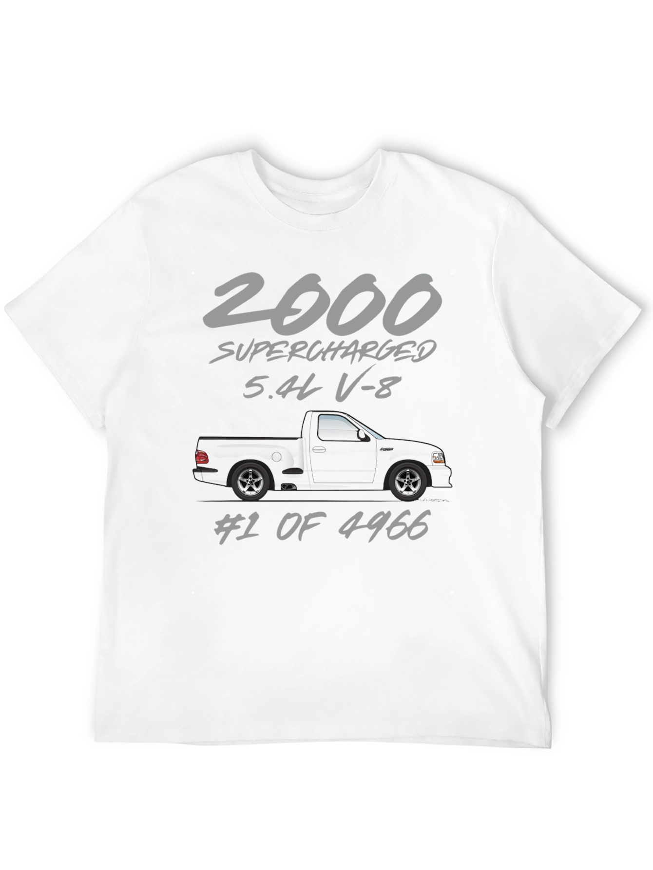 Show off your love for classic trucks with this cool t-shirt! This black tee features a bold graphic design of a 2000 supercharged 5.4L V-8 truck, along with "2000 SUPERCHARGED 5.4L V-8" and "#1 OF 4966" printed in silver. Made from a comfortable fabric, this shirt is perfect for casual wear, car meets, or any occasion where you want to express your passion for automotive history. A great gift for truck enthusiasts!