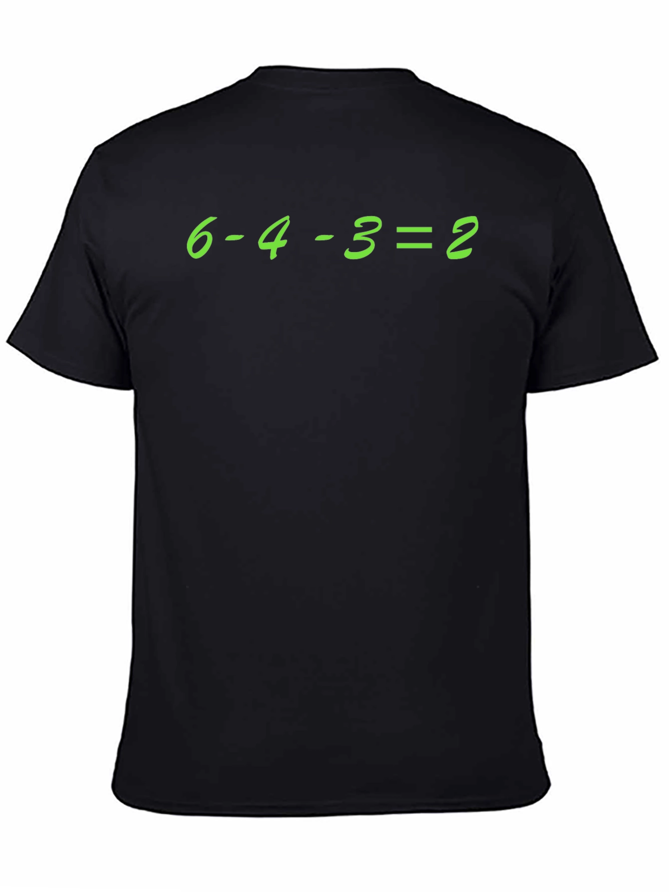 This black t-shirt features the math equation "6-4-3=2" in a vibrant green, clearly visible across the chest. The shirt is made of what appears to be a comfortable, soft fabric, perfect for casual wear. Its design suggests a playful nod to baseball fans, referencing a common play. The classic fit ensures a relaxed feel, making it ideal for everyday activities, sports events, or as a conversation starter. Whether you're at a game or out with friends, this tee combines comfort with a touch of sporty humor, making it a great addition to any casual wardrobe.