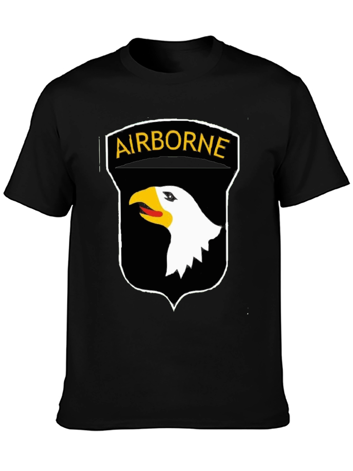 Showcase your military pride with this striking black t-shirt featuring the iconic Airborne emblem. The design displays a detailed eagle head in white, beak in yellow/gold and red detail, set against a black shield with a bold, gold "AIRBORNE" banner at the top. The graphic is crisp and eye-catching. Made from what appears to be comfortable, breathable cotton, this tee is perfect for casual wear, showing support at military events, or gifting to a veteran. The classic fit and short sleeves make it a versatile addition to any wardrobe. Make a statement with this stylish tribute to airborne forces.