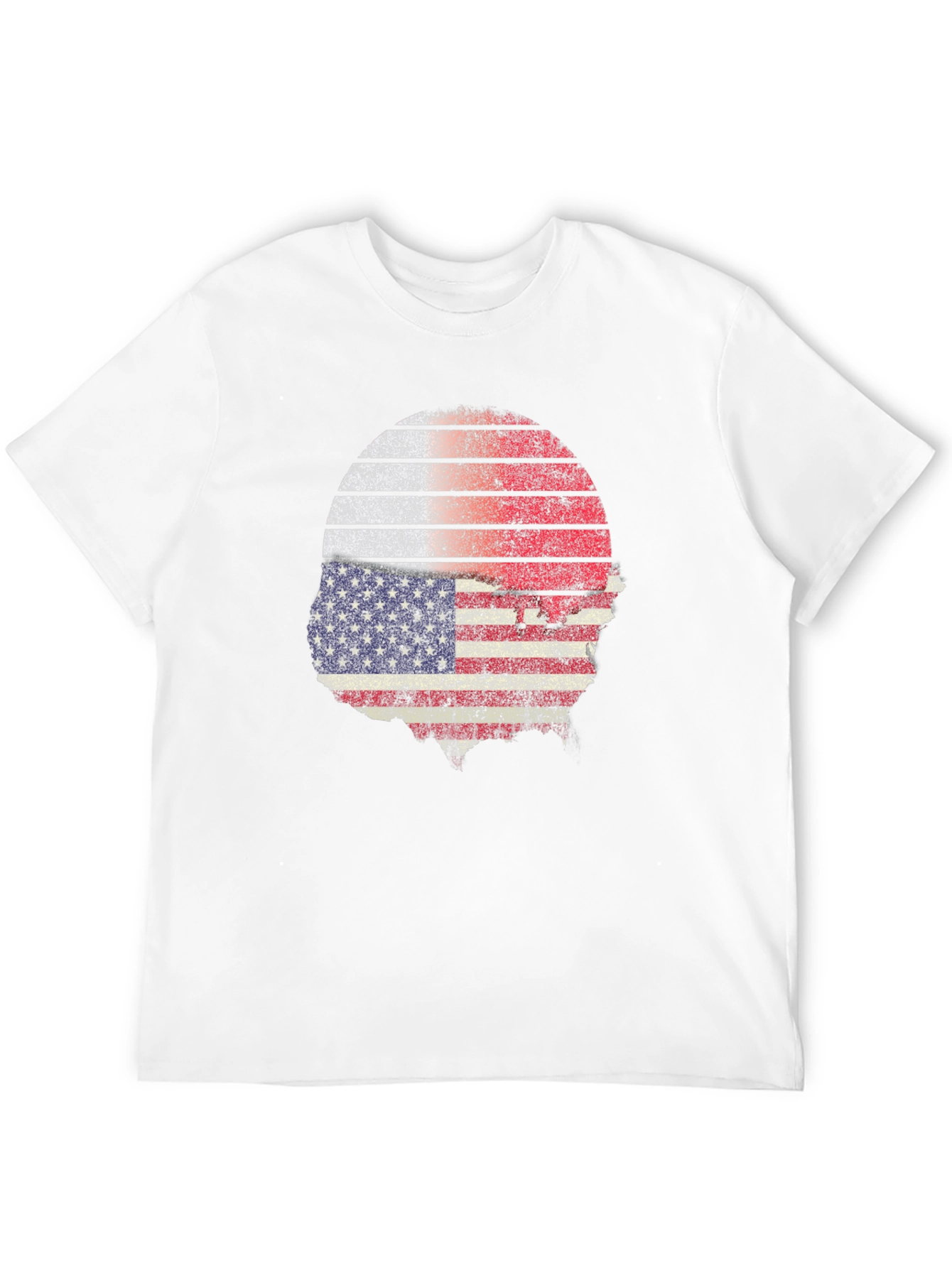 Show your patriotic side with this striking black t-shirt featuring a unique American flag skull graphic. The design incorporates the stars and stripes within the shape of a skull, giving it an edgy, vintage look. Made from comfortable fabric, this tee is perfect for casual wear, Fourth of July celebrations, or showing your love for the USA. The eye-catching design is sure to turn heads and spark conversations. Express your individuality and American pride with this stylish and versatile t-shirt. A must-have addition to any wardrobe!