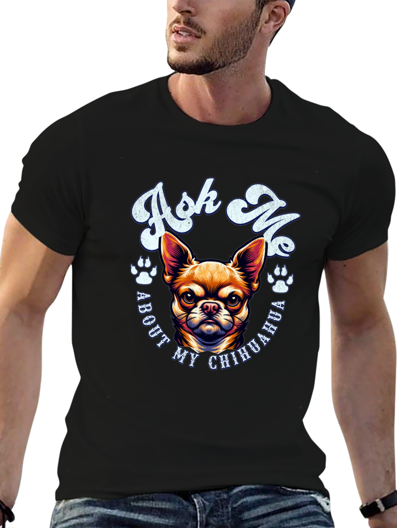 Show off your love for Chihuahuas with this unique t-shirt! The shirt features a vibrant graphic of a Chihuahua's face, surrounded by paw prints and the phrase "Ask Me About My Chihuahua". This design is printed on a comfortable, black fabric tee, perfect for casual wear. Wear it to the dog park, on walks, or just lounging at home to spark conversations and share your passion for your favorite breed. This is a must-have for any Chihuahua owner or enthusiast, making it a great gift option too!