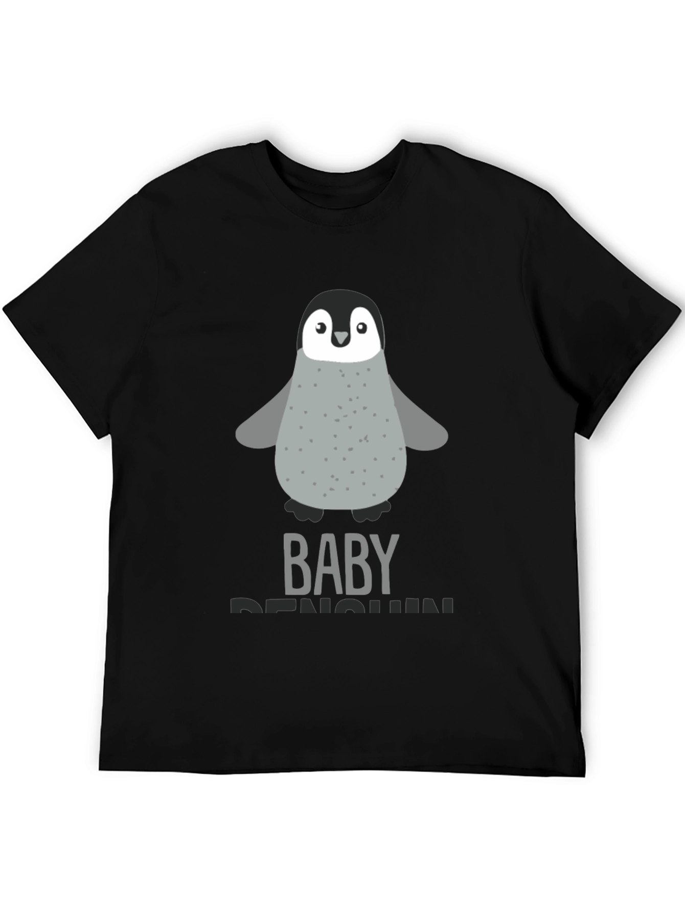 This black t-shirt features a charming baby penguin graphic, making it a delightful addition to any casual wardrobe. The design showcases an adorable penguin with a gray speckled body, dark gray head, and white belly. 'BABY PENGUIN' is written beneath the penguin. Made from a comfortable-looking fabric, this tee is ideal for everyday wear. Its playful design is perfect for penguin lovers, parents, or anyone seeking a fun and unique statement piece. Pair it with jeans, shorts, or leggings for a relaxed and stylish look. Wear your penguin pride with this cute and cozy tee!