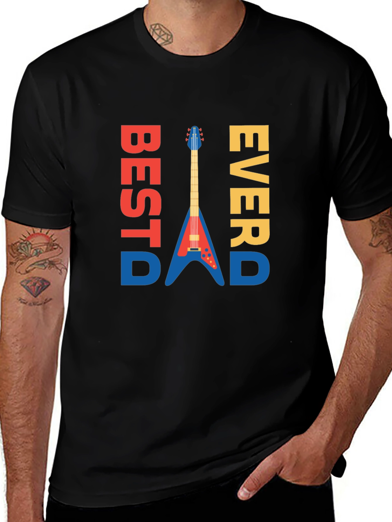 Celebrate the best dad in the world with this stylish black graphic tee. The shirt features a colorful design with "BEST DAD EVER" flanking an illustrated electric guitar. Ideal for music-loving fathers, this comfortable tee is perfect for casual wear, family gatherings, or Father's Day celebrations. Made from soft, breathable fabric, it ensures all-day comfort. Show your appreciation with this unique and thoughtful gift that any rockstar dad will love to wear!