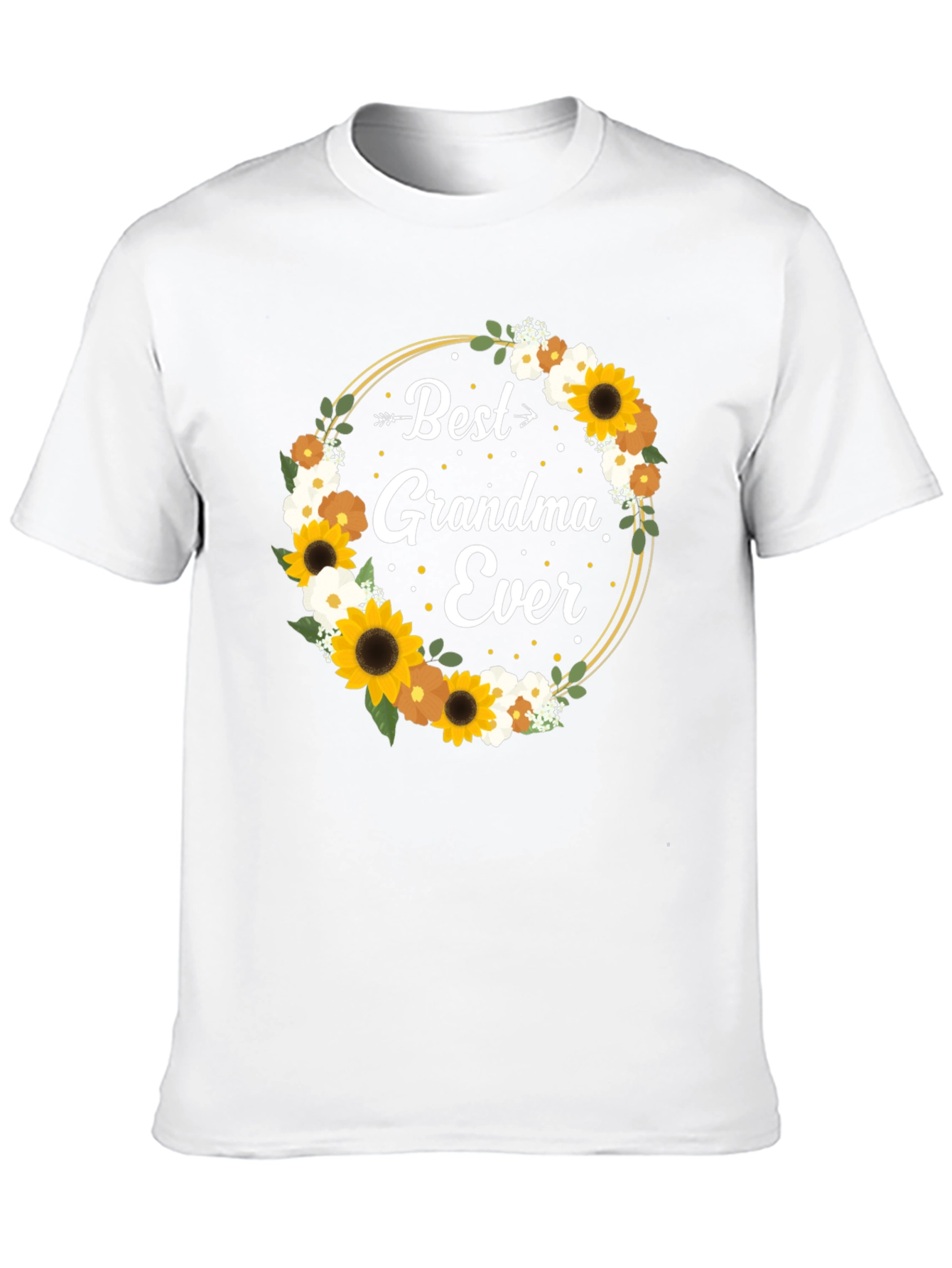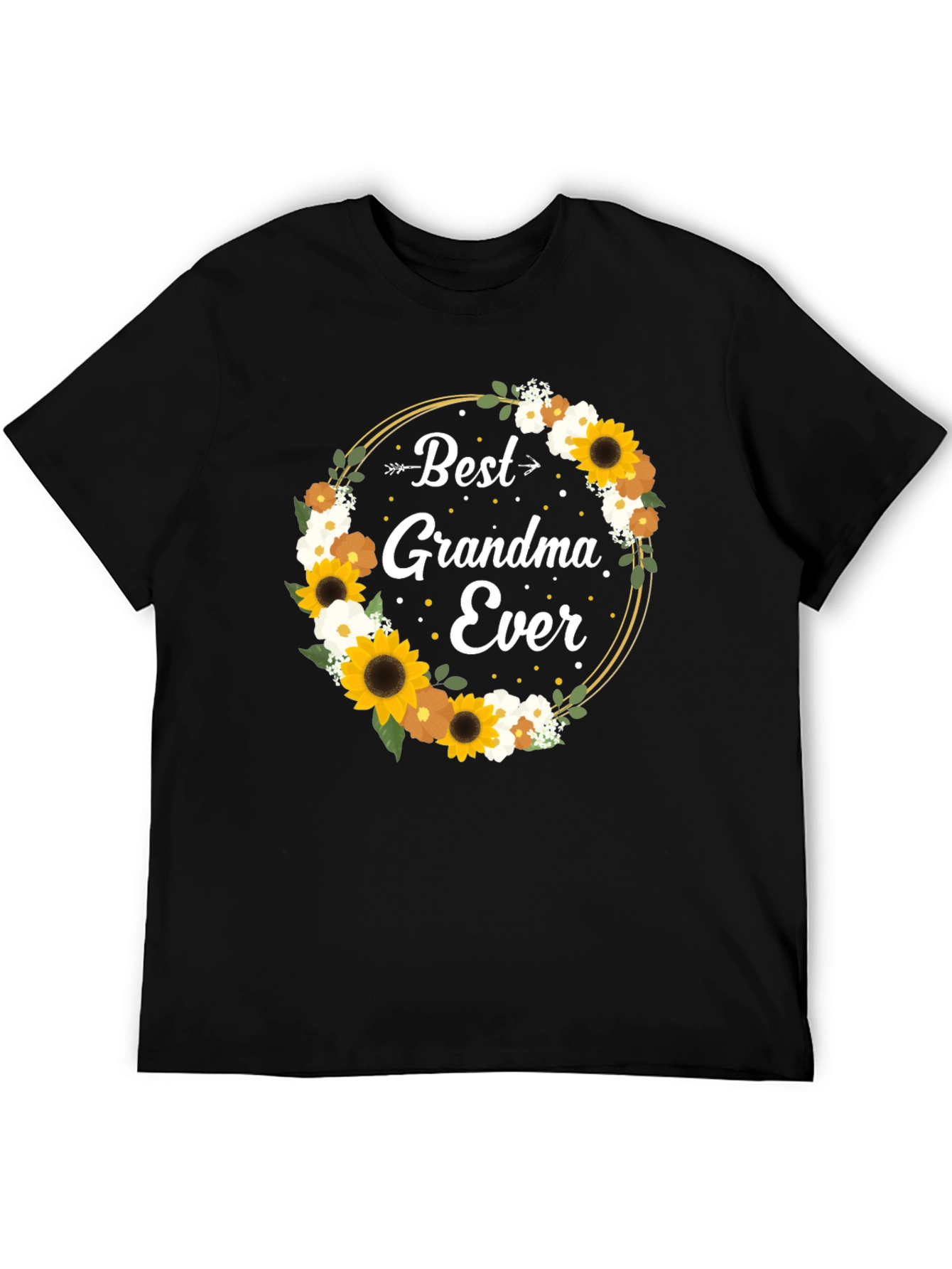 Show your love for Grandma with this charming black t-shirt. It features a delightful floral wreath design with sunflowers and other delicate blooms encircling the heartfelt message "Best Grandma Ever." The design is printed on a comfortable, classic fit black tee, perfect for everyday wear. This t-shirt makes a thoughtful and stylish gift for birthdays, holidays, or just because. The shirt's design is sure to bring a smile to Grandma's face and let her know how much she is appreciated. A great casual addition to her wardrobe.