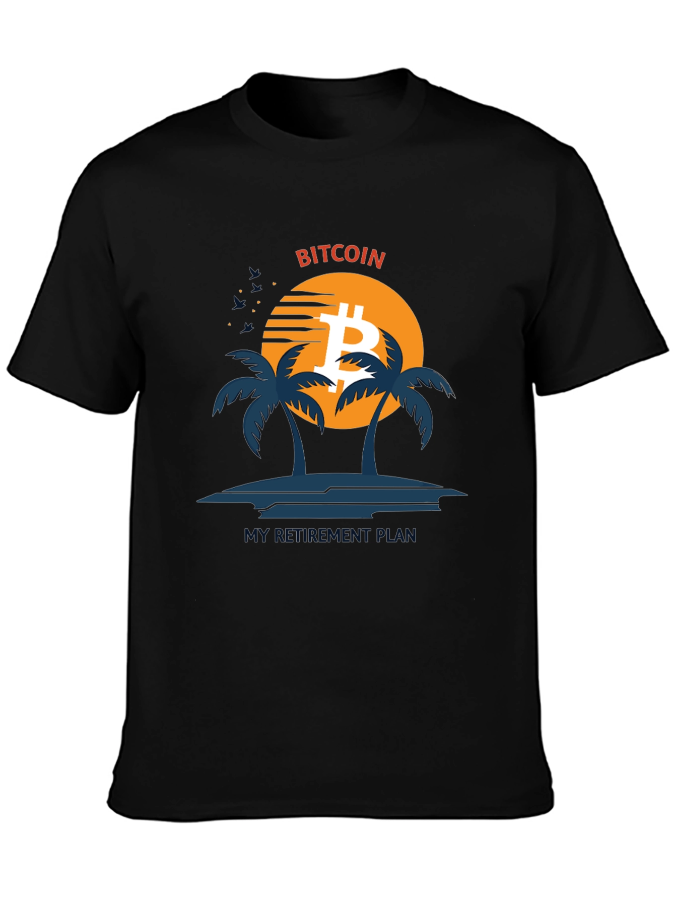 Show off your investment strategy with this Bitcoin retirement plan graphic tee. This black tee features a vibrant design of a tropical island sunset with palm trees, incorporating the Bitcoin symbol. The words 'Bitcoin' and 'My Retirement Plan' are also part of the graphic. It's a great conversation starter and a comfortable way to express your enthusiasm for cryptocurrency. Perfect for casual wear, crypto meetups, or as a gift for the Bitcoin enthusiast in your life. Add some crypto humor to your wardrobe!