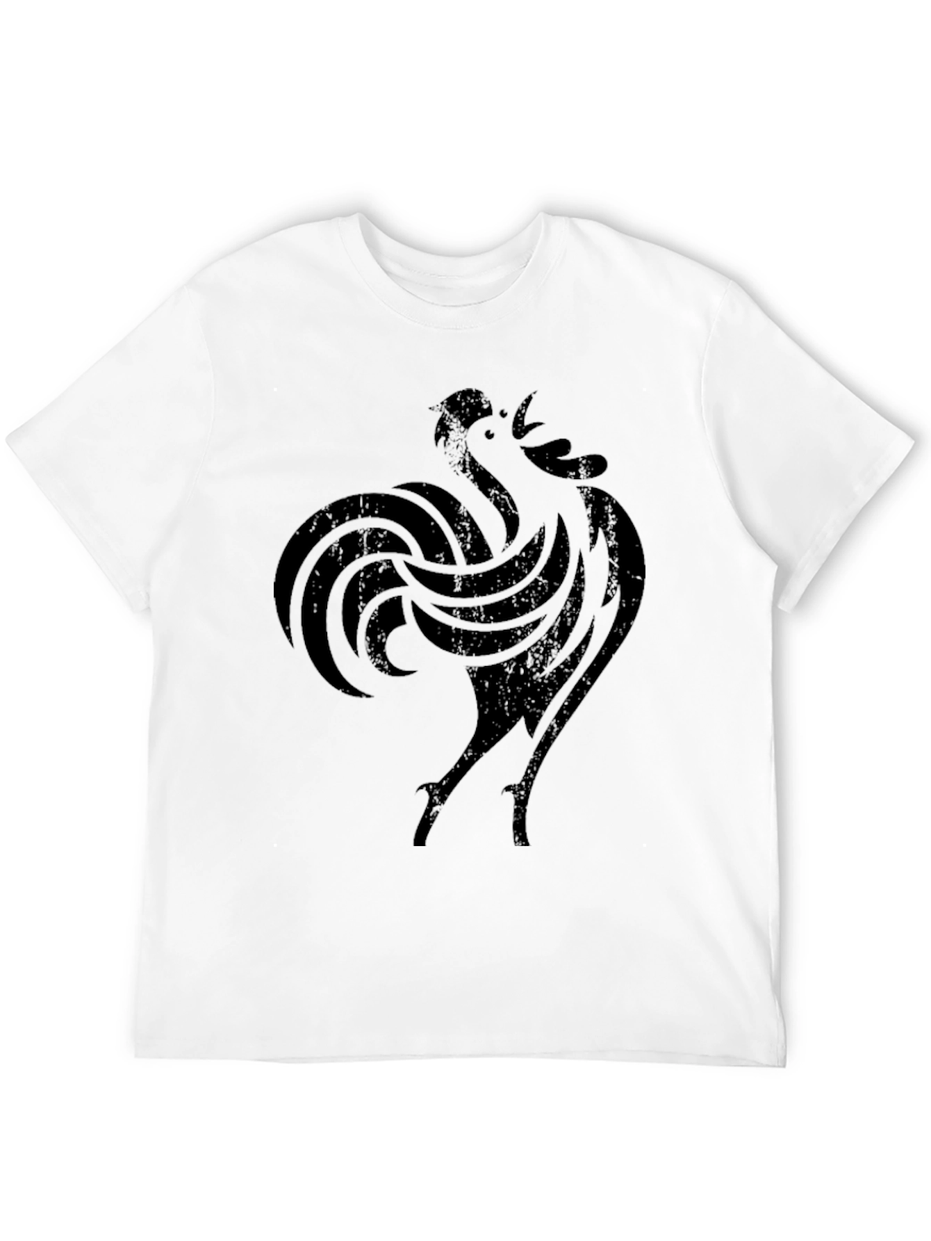 Show off your unique style with this bold black t-shirt. Featuring a distressed rooster graphic print, this tee is perfect for adding an edgy touch to your wardrobe. Crafted from a soft, comfortable fabric, it offers a relaxed fit for all-day wear. The monochromatic design makes it easy to pair with jeans, shorts, or joggers. Ideal for casual outings, concerts, or just lounging around, this rooster graphic t-shirt is a must-have for those who want to stand out from the crowd. Make a statement and unleash your inner rebel!