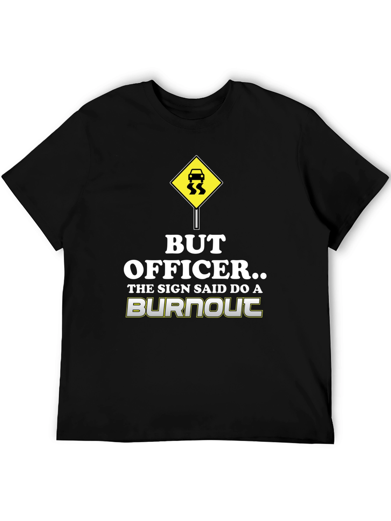 Make a statement with this bold black t-shirt featuring a humorous graphic. The design showcases a yellow road sign with a car drifting, playfully suggesting the wearer was 'following instructions'. Above and below the sign, it reads "BUT OFFICER... THE SIGN SAID DO A BURNOUT" in eye-catching white and yellow lettering. Made from what appears to be soft, breathable cotton, this tee is perfect for casual wear, car meets, or as a fun gift for the auto enthusiast in your life. Show off your love for cars and a good sense of humor with this conversation-starting tee!