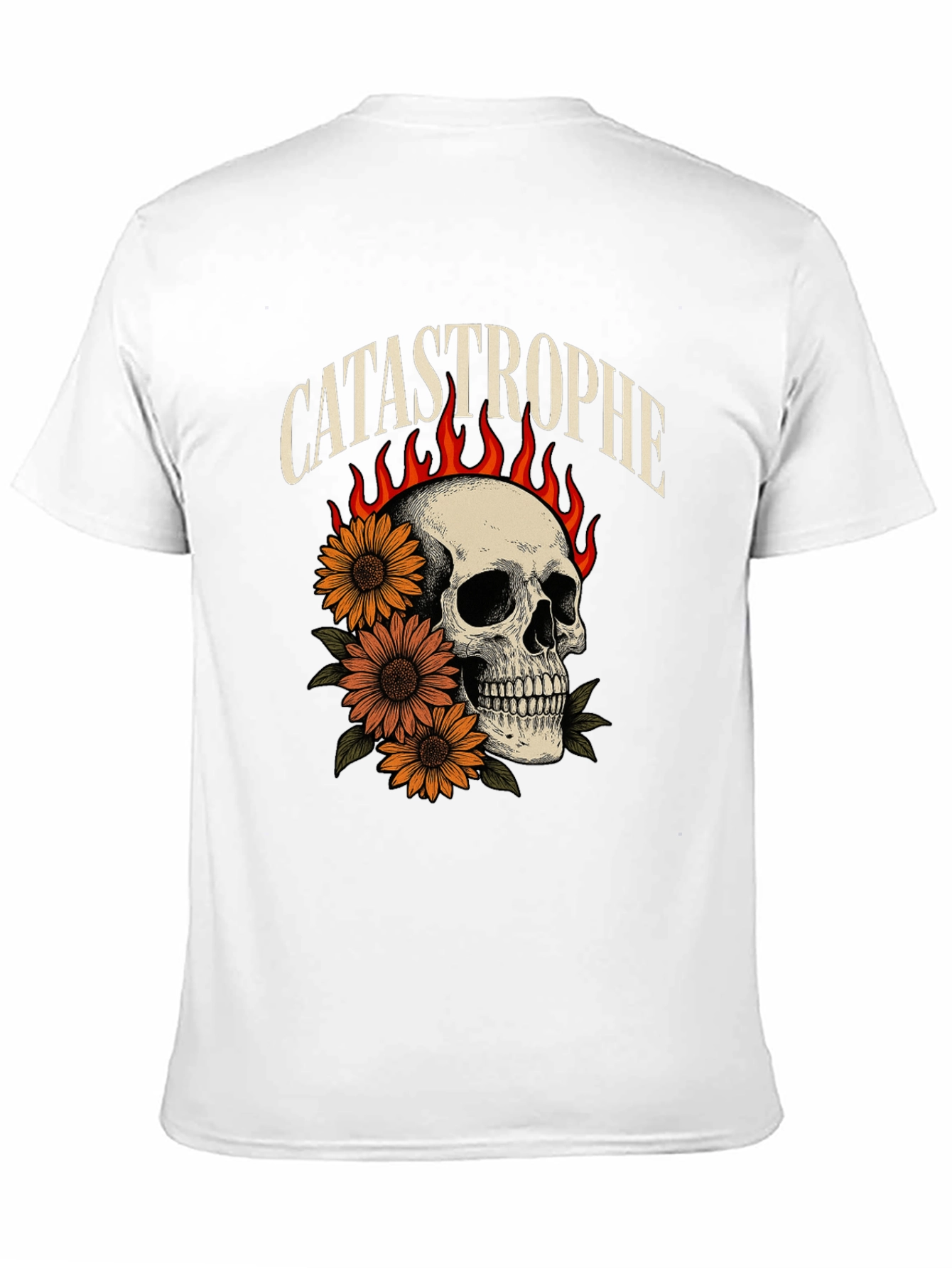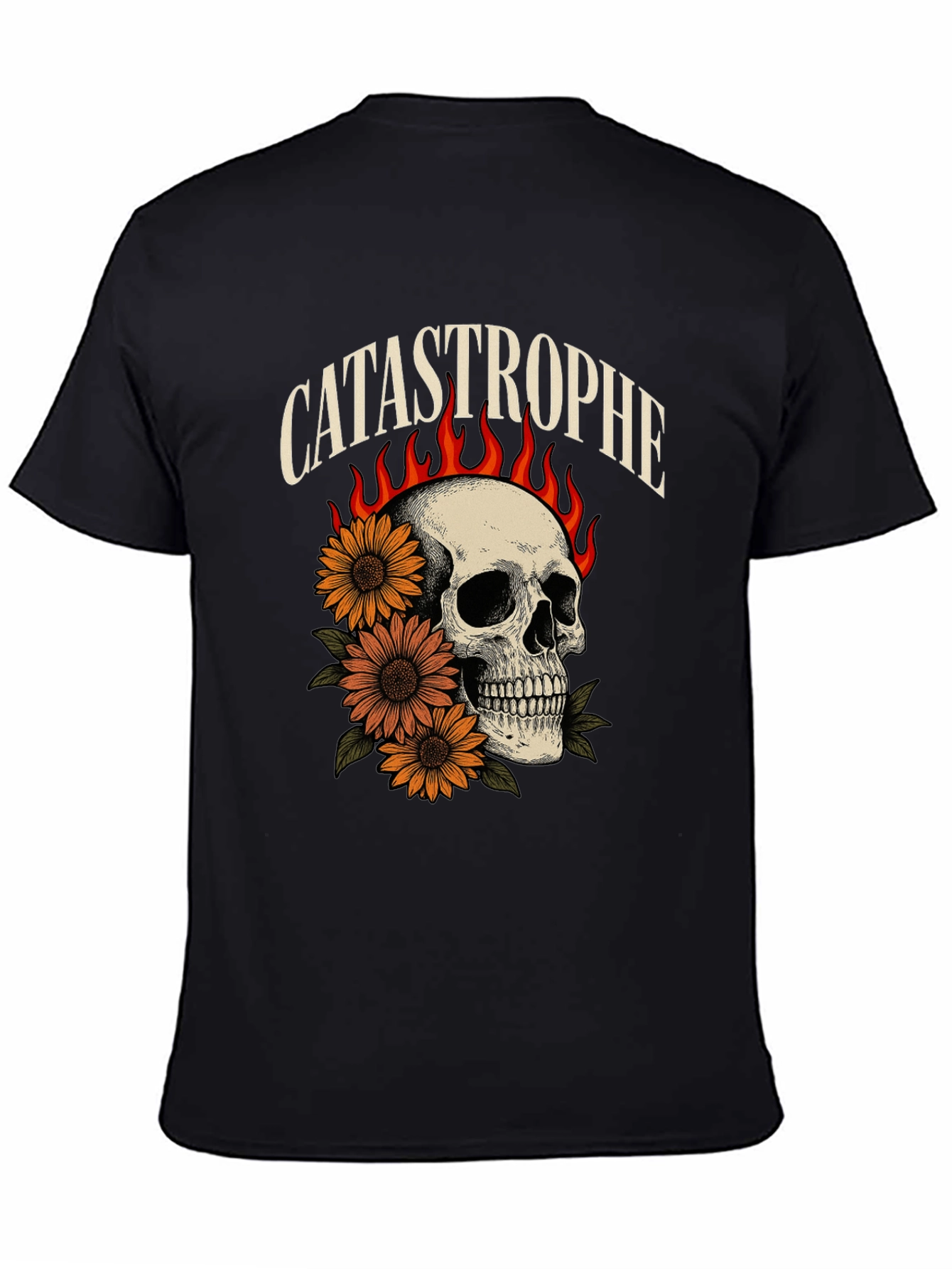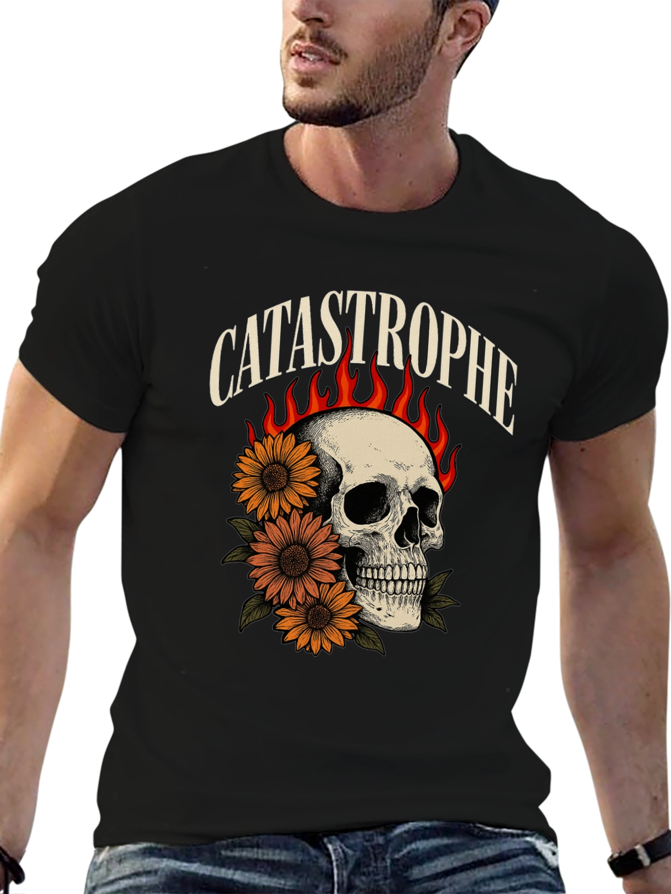 Embrace edgy style with this striking black t-shirt. The focal point is a captivating graphic featuring a skull surrounded by vibrant sunflowers and fiery accents, topped with the word "Catastrophe". This design creates a bold statement. Made from comfortable, breathable fabric, this tee is perfect for everyday wear or making a statement at concerts and casual gatherings. Pair it with jeans, shorts, or a skirt for a versatile, eye-catching look. Stand out from the crowd and express your unique personality with this must-have graphic tee!