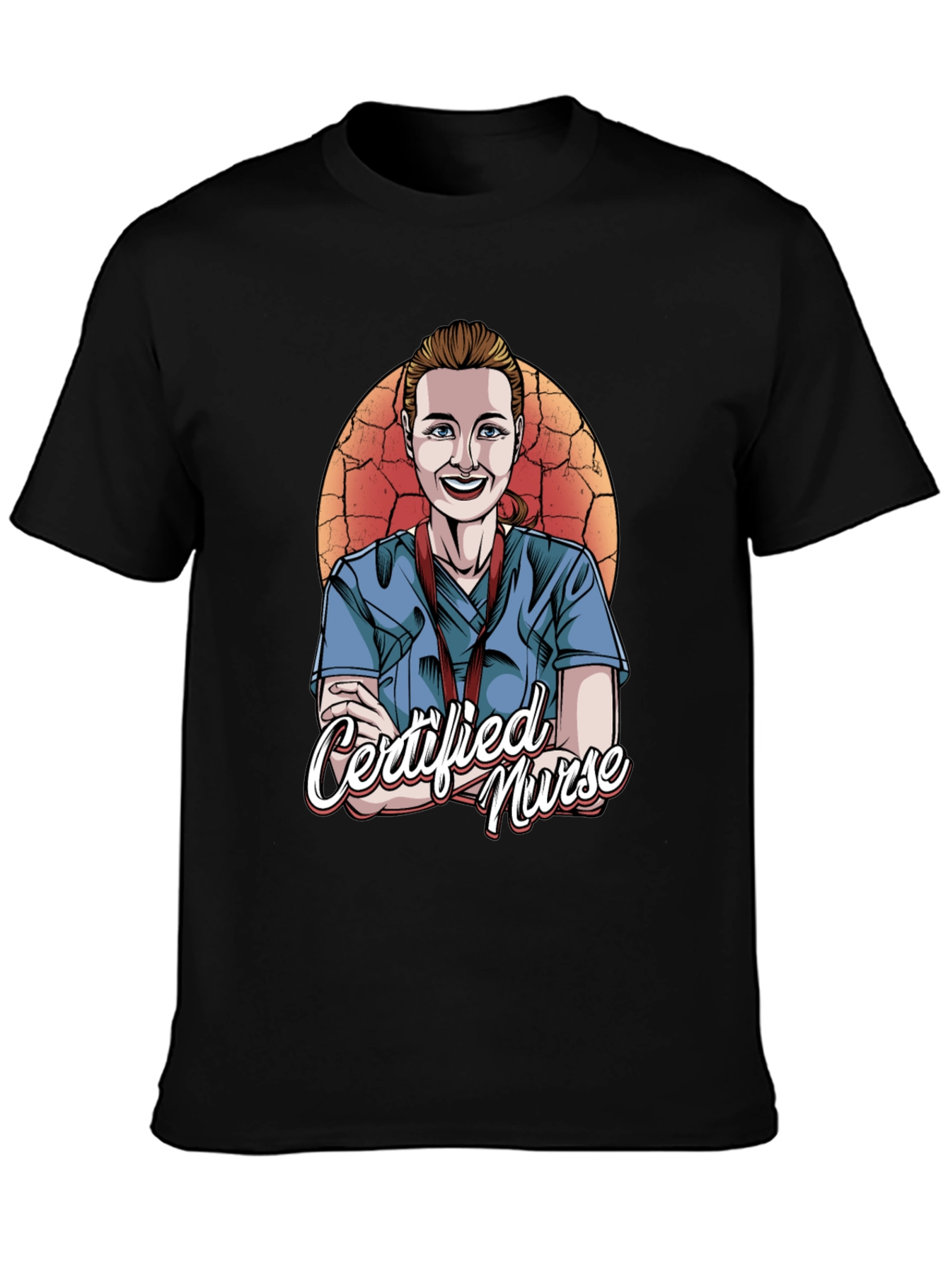 Show your appreciation for nurses with this unique graphic t-shirt. The black tee features a vibrant cartoon-style design of a smiling, confident certified nurse. She is set against a textured orange backdrop, with the words "Certified Nurse" displayed in a stylish script. This eye-catching design makes a statement and celebrates the dedication of healthcare professionals. Made from what appears to be a comfortable, breathable fabric, this t-shirt is perfect for everyday wear, casual outings, or showing support at healthcare events. It’s a great gift idea for the nurses in your life or a stylish way to show your own pride in the profession.