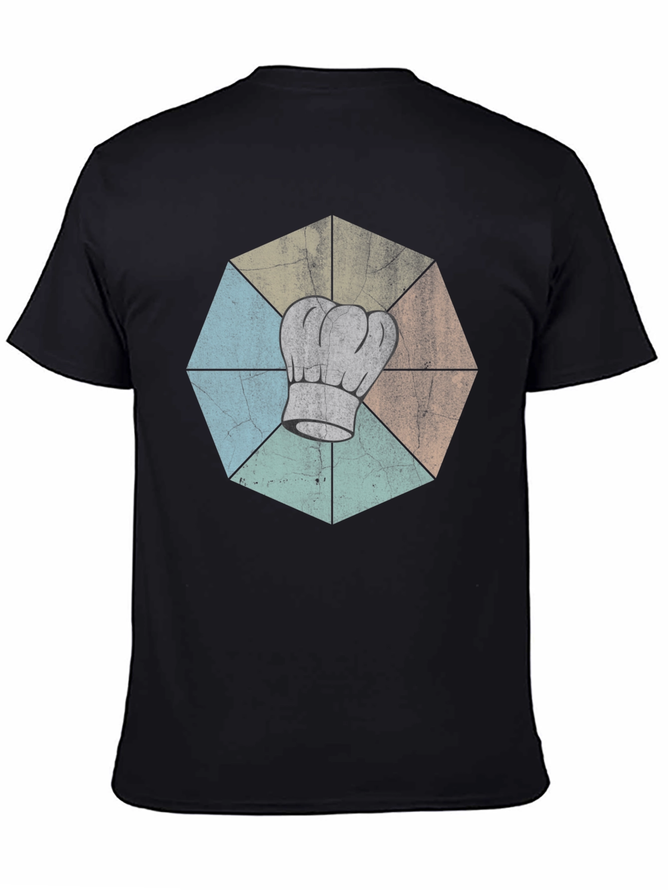 This black t-shirt features a retro, geometric design with a chef's hat at the center. The octagon shape is divided into various vintage-inspired colors that give a distressed look. Made from comfortable fabric, it is perfect for everyday wear. The graphic design makes this shirt a unique gift for chefs or cooking enthusiasts. Pair it with jeans for a casual look or dress it up with a blazer for a stylish, relaxed outfit.