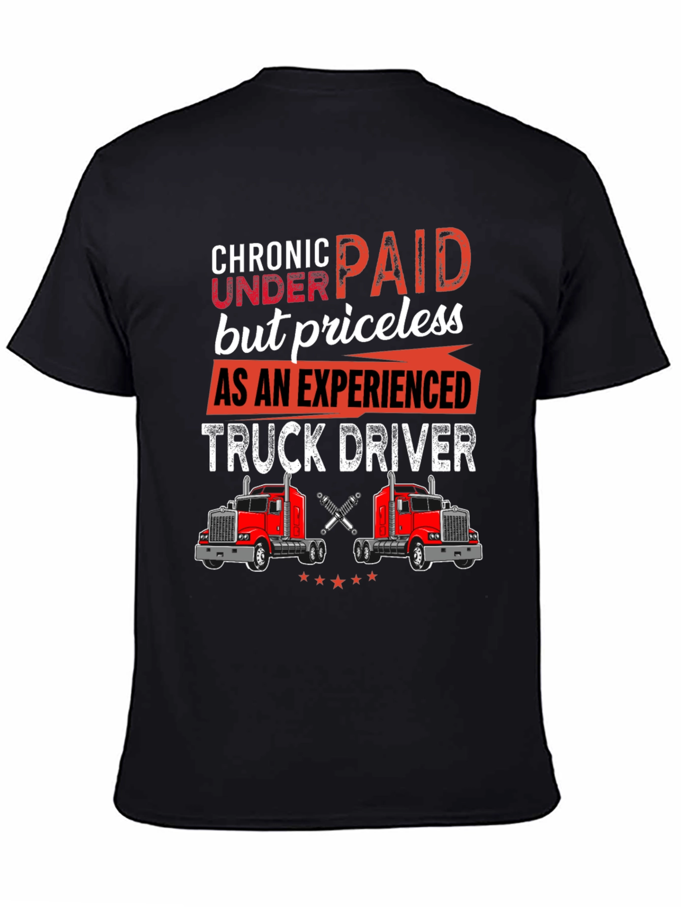 Show your truck driver pride with this unique black t-shirt! The design features the humorous slogan "Chronic Underpaid but priceless AS AN EXPERIENCED TRUCK DRIVER" in bold red and white fonts. Below, two detailed red semi-truck illustrations are displayed, adding to the trucking theme. Perfect for casual wear, truck stops, or a gift for the hard-working truck driver in your life. This t-shirt makes a statement about the value and experience of truckers. Wear it with pride and celebrate your profession!