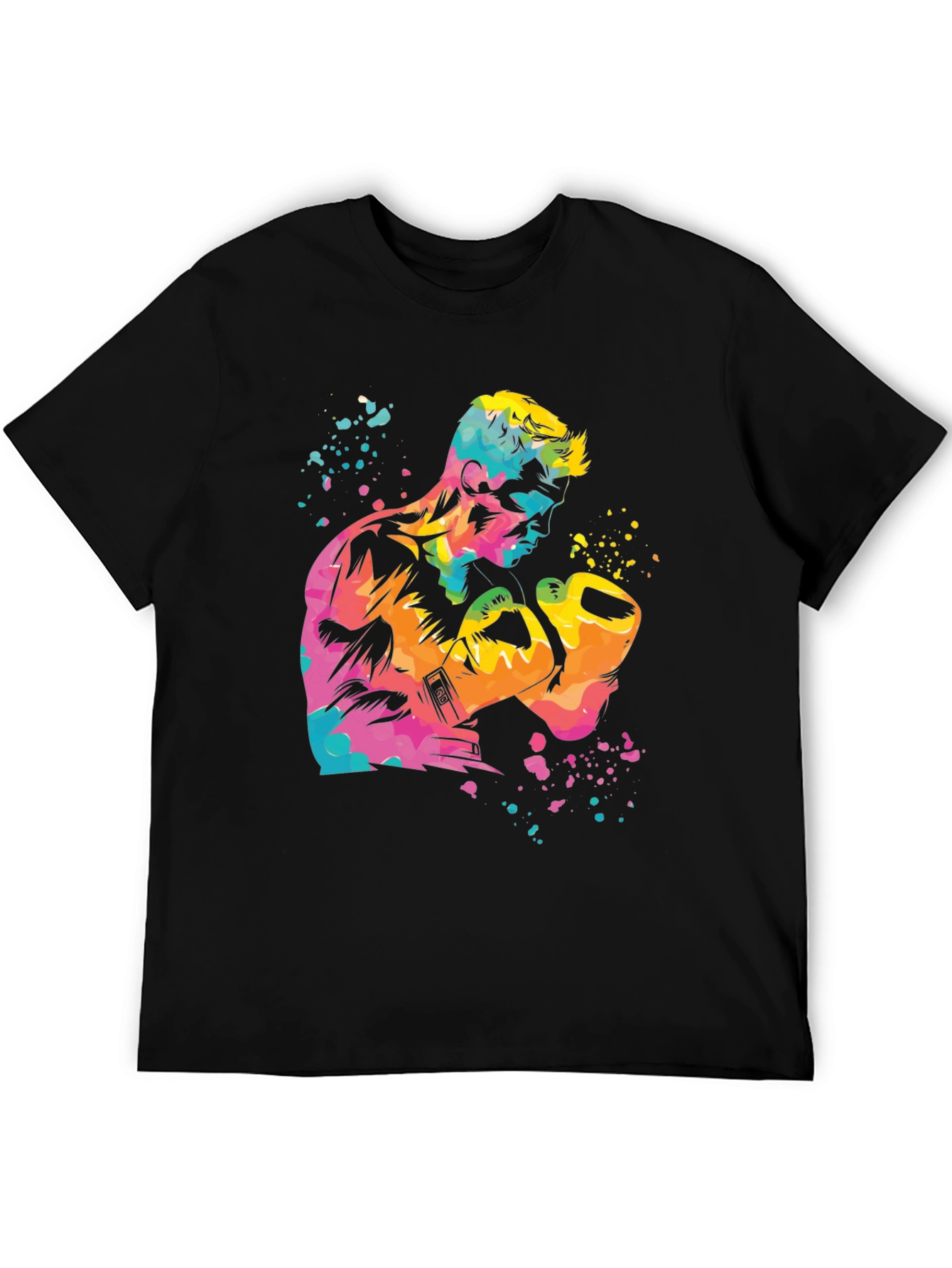 Show off your unique style with this eye-catching black t-shirt featuring a vibrant, colorful graphic of a boxer. The striking design uses a watercolor effect, giving it a modern and artistic look. Made from a comfortable, breathable fabric, this tee is perfect for everyday wear. Whether you're hitting the gym or hanging out with friends, this shirt is sure to make a statement. Stand out from the crowd with this bold and expressive piece. A must-have for sports enthusiasts and art lovers alike!