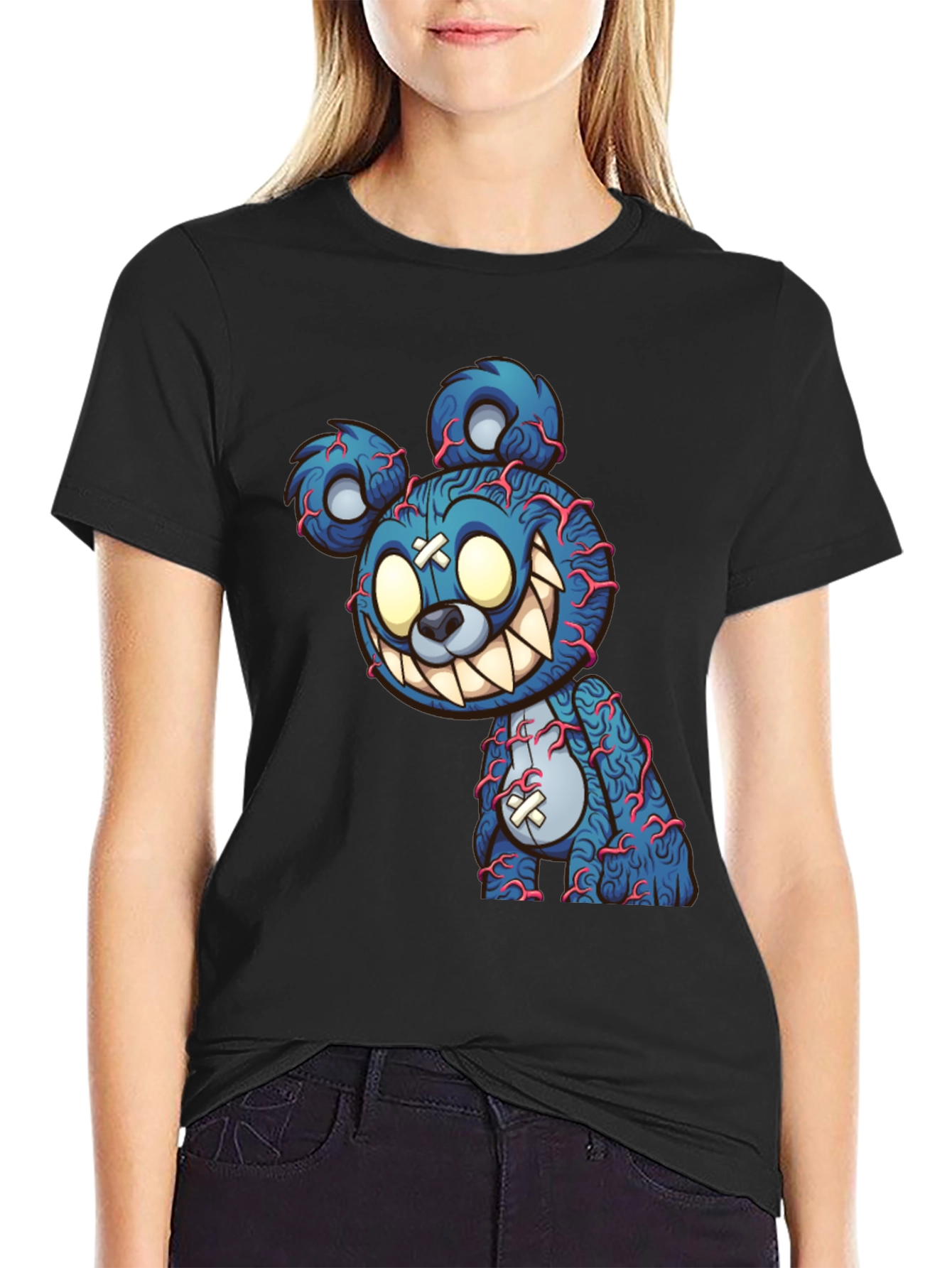 This black t-shirt features a unique and eye-catching graphic of a creepy cartoon bear. The bear is rendered in shades of blue with detailed, textured patterns and bright yellow eyes, giving it a playful yet slightly unsettling appearance. The design includes stitched details and bandages, adding to its quirky charm. Made from comfortable fabric, this tee is perfect for casual wear. It's ideal for those who appreciate unconventional and artistic designs. Stand out with this unique and expressive t-shirt, perfect for everyday wear or as a statement piece in your wardrobe.