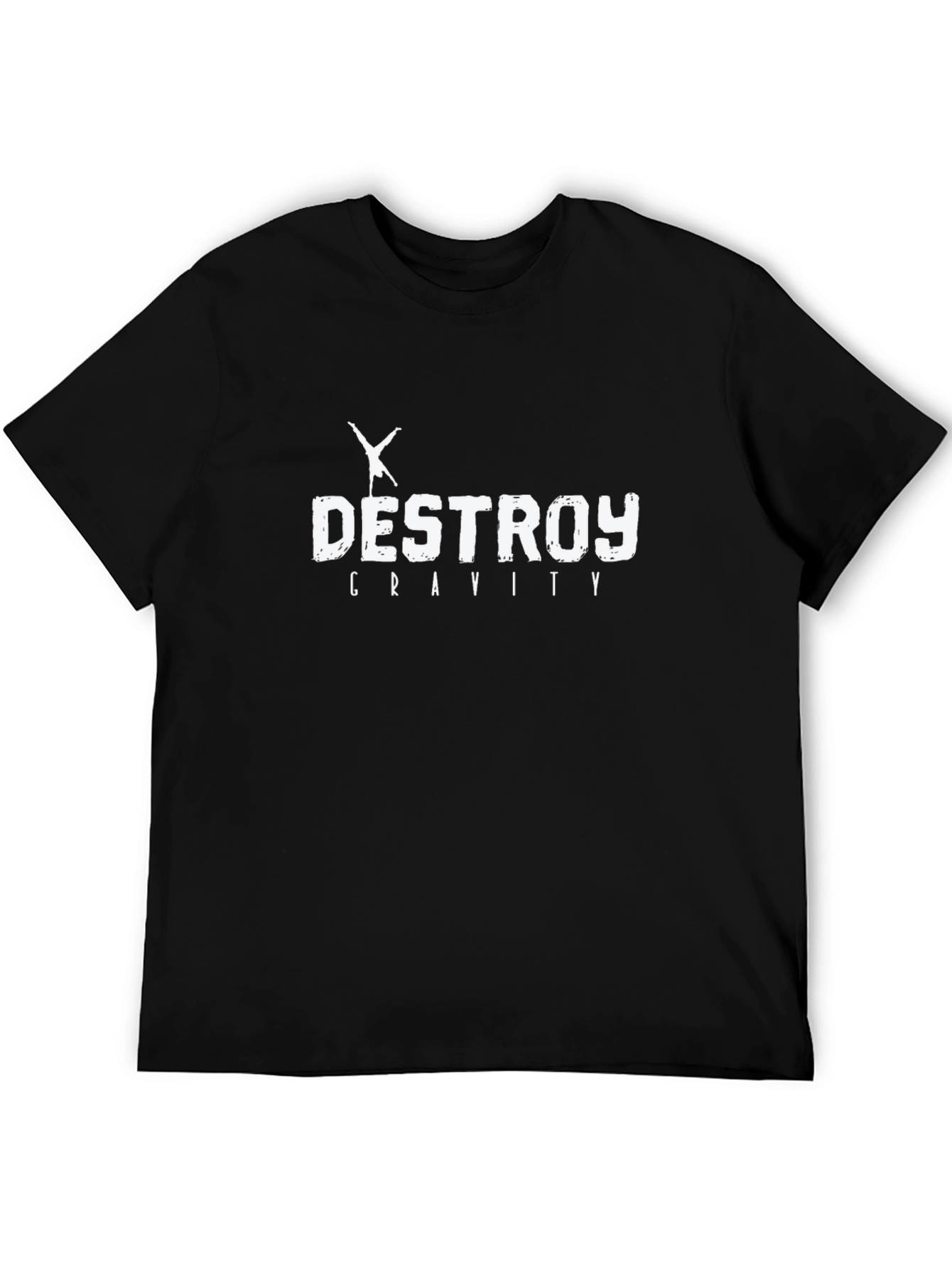 This black t-shirt features a bold, white "DESTROY GRAVITY" graphic on the chest, perfect for those who love extreme sports or making a statement. The design includes a stylized figure in a handstand pose, adding a dynamic edge to the classic tee. Made from what appears to be a comfortable and durable cotton blend, this t-shirt is ideal for everyday wear or as a casual athletic option. The short sleeves and crew neck provide a timeless fit, making it versatile for various outfits and occasions. It's a great conversation starter and a must-have for anyone with a rebellious spirit.