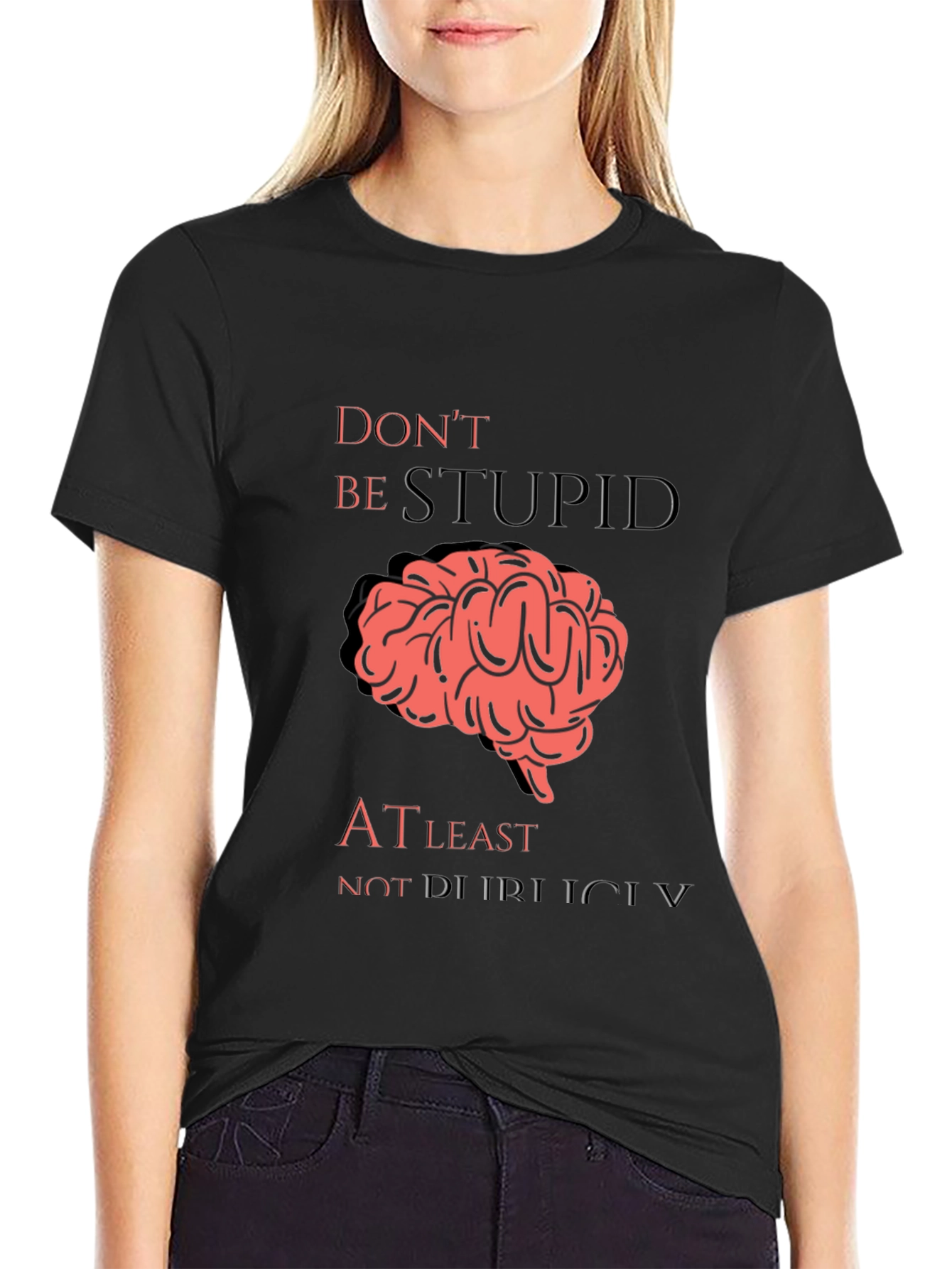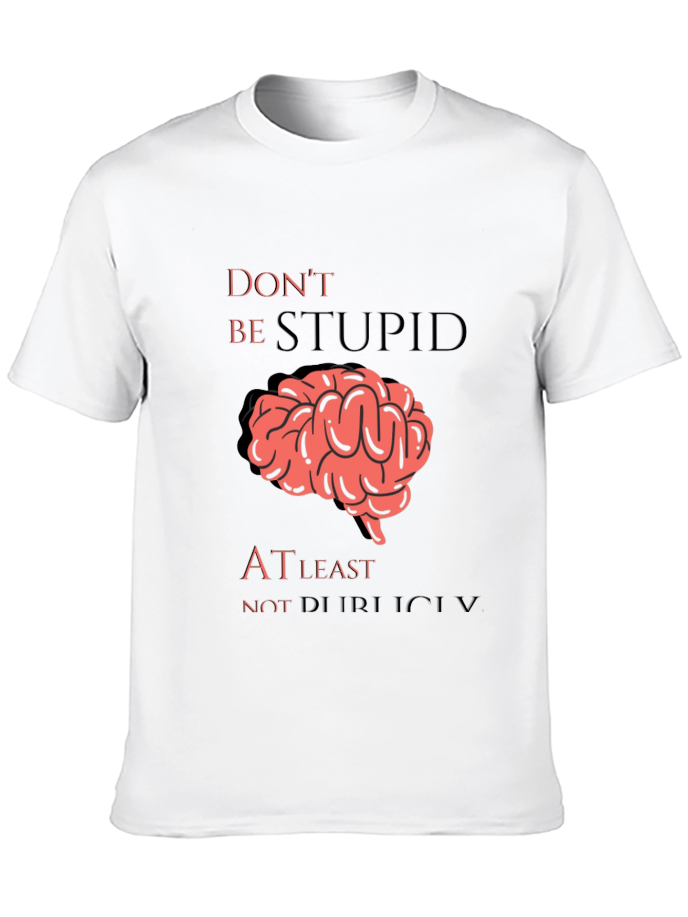 This black t-shirt features a humorous and thought-provoking design, perfect for casual wear. The front of the shirt displays the text "DON'T BE STUPID AT LEAST NOT PUBLICLY" in a slightly distressed font, accompanied by a stylized brain graphic in a vibrant color. The design is eye-catching and serves as a playful reminder. Made from what appears to be a soft, comfortable fabric, this tee is ideal for everyday use. It’s a great conversation starter and a fun addition to any wardrobe, suitable for anyone with a sense of humor. Whether you're lounging at home or out with friends, this shirt is sure to make a statement.