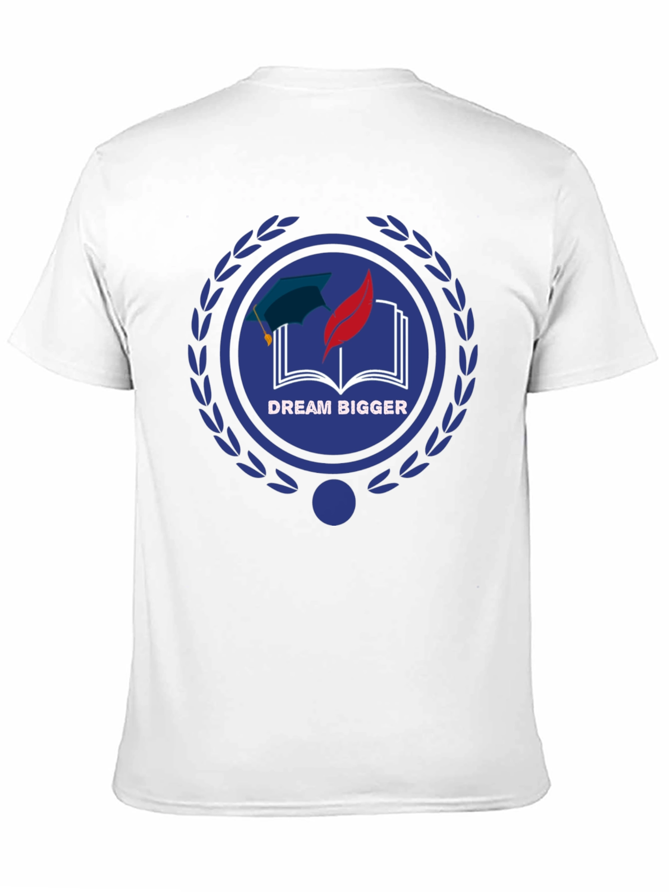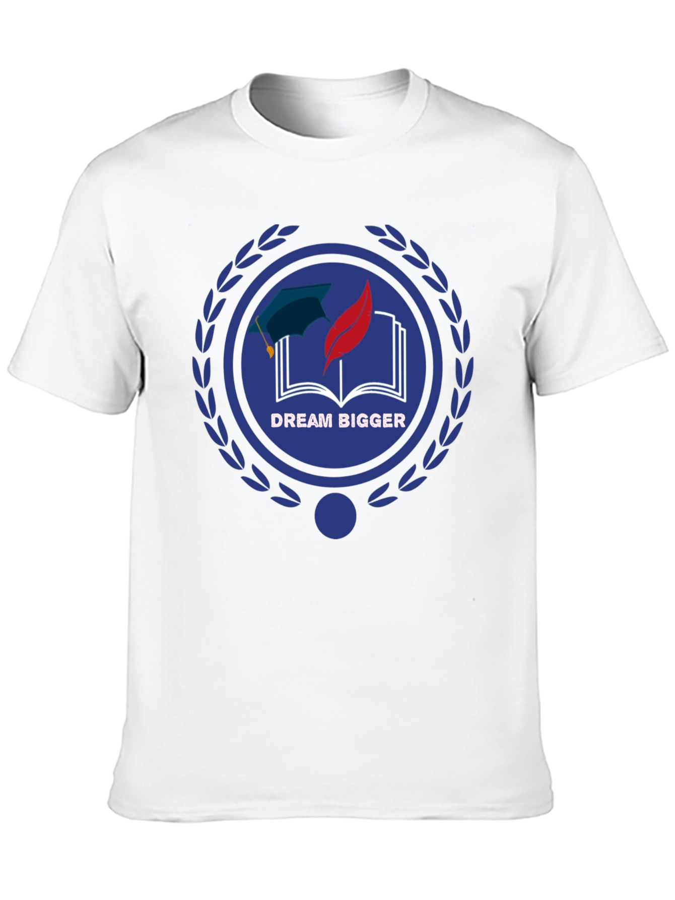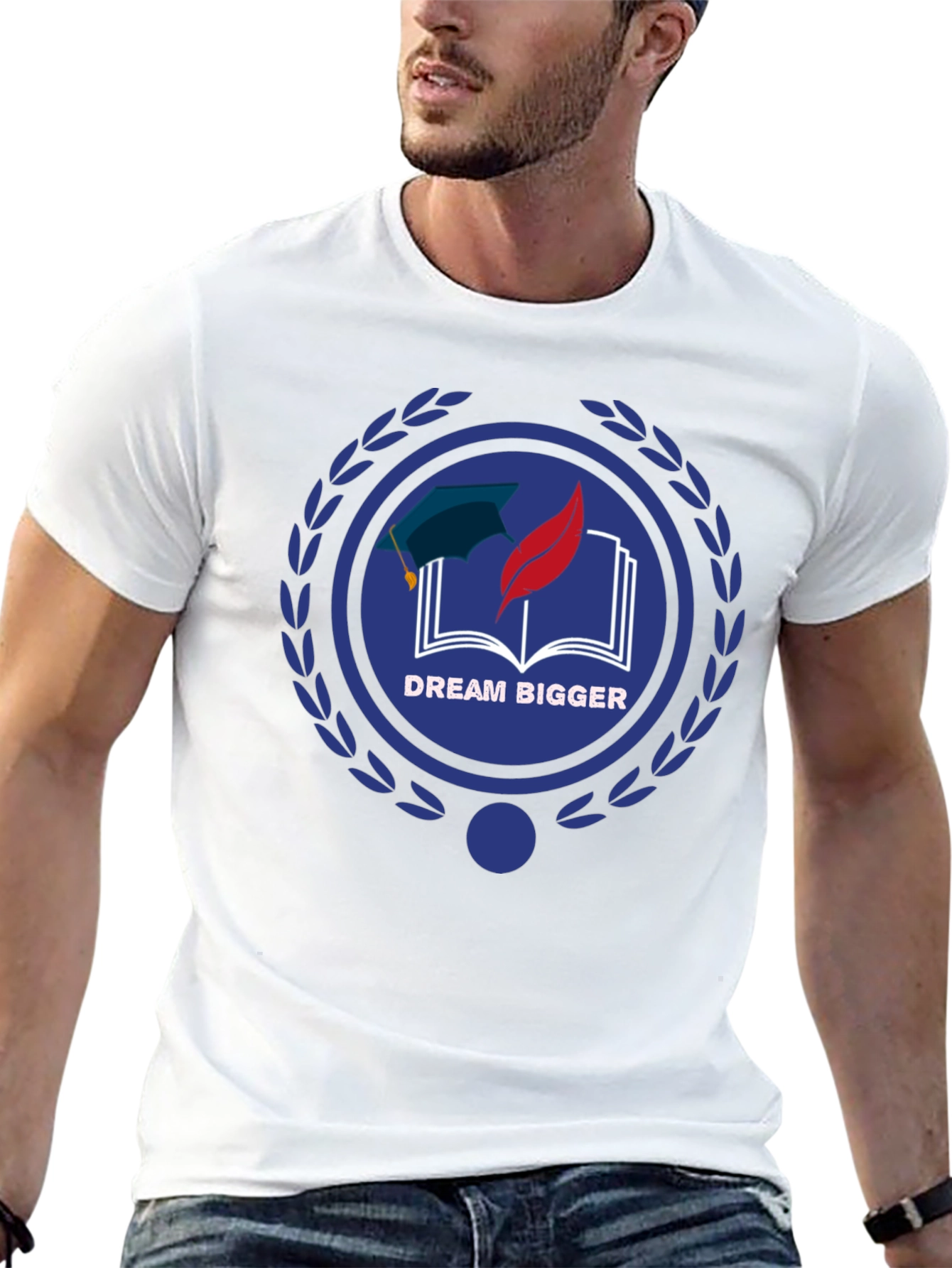 This stylish black t-shirt features a unique graphic design, perfect for adding a touch of inspiration to your everyday wear. The design includes a graduation cap, a quill, and an open book encircled by laurel leaves, along with the empowering phrase "DREAM BIGGER." Made from comfortable cotton, this tee offers a great fit and feel. Ideal for students, graduates, or anyone with big aspirations, this t-shirt can be worn casually or dressed up with a blazer. Show off your ambition and inspire others with this eye-catching tee.