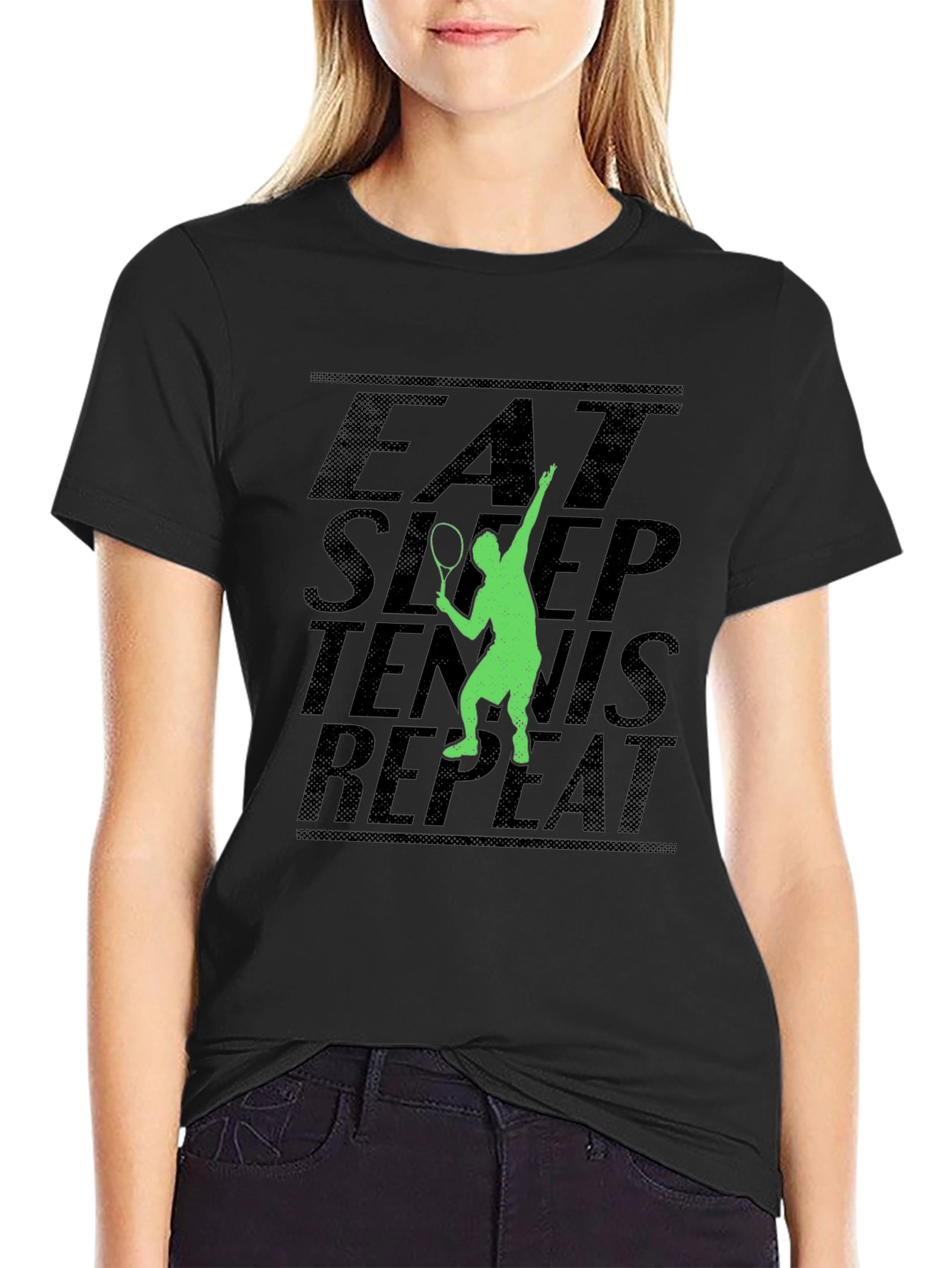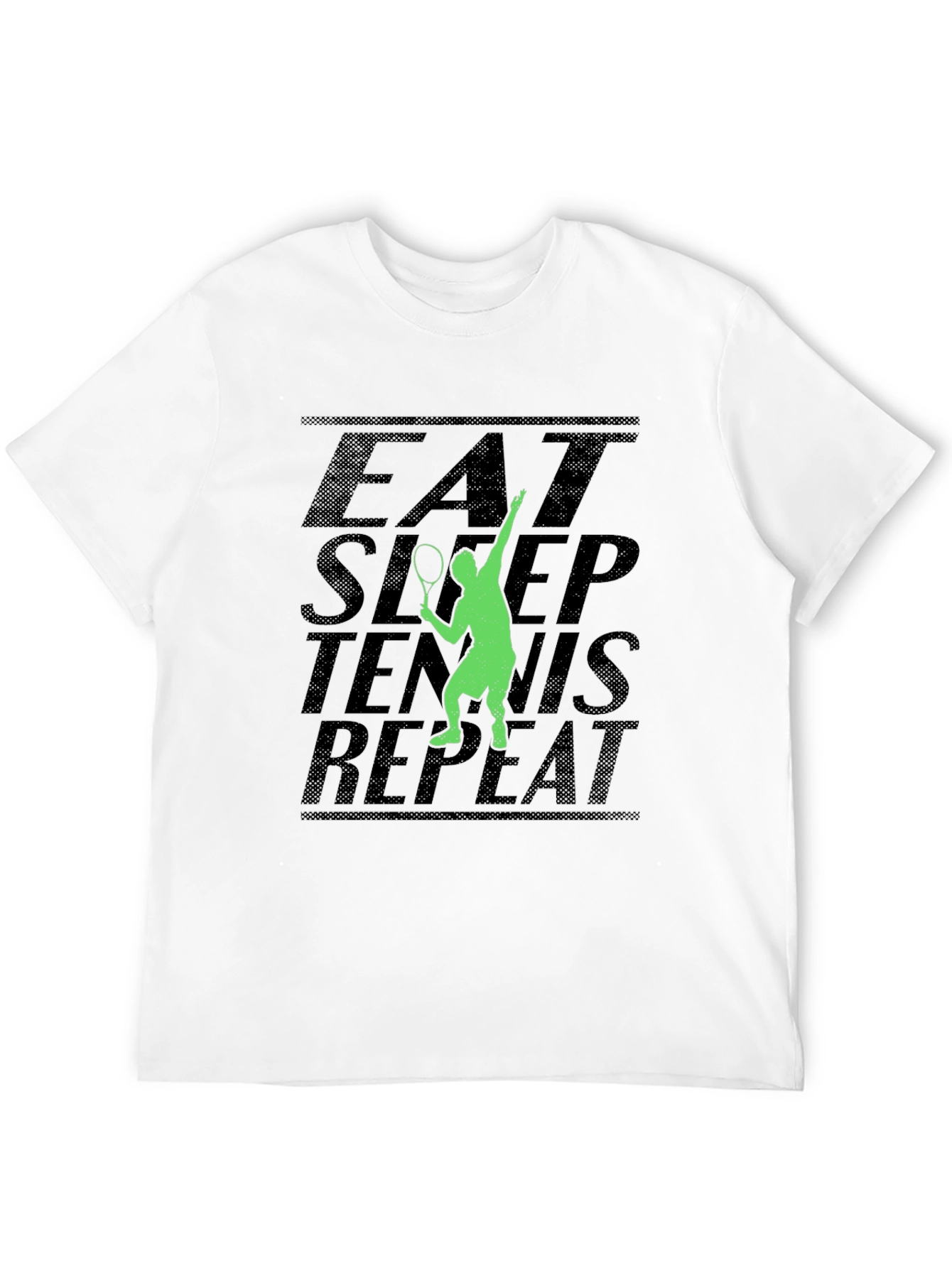 This stylish black t-shirt features a bold "Eat Sleep Tennis Repeat" graphic, perfect for tennis enthusiasts. The design incorporates a vibrant green silhouette of a tennis player in action, adding a sporty and energetic touch. Made from a comfortable-looking fabric, this tee is ideal for casual wear, workouts, or showing off your love for the game. Pair it with jeans, shorts, or athletic wear for a cool, relaxed look. Whether you're on the court or simply hanging out, this t-shirt is a great way to express your passion for tennis. Get yours today and live the tennis lifestyle!
