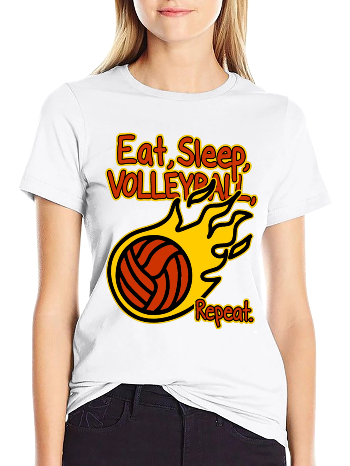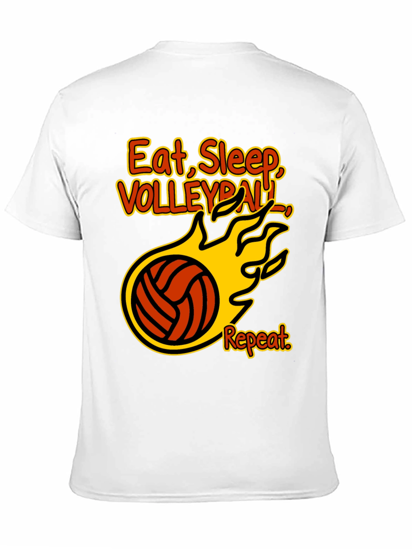 Showcase your love for volleyball with this stylish black t-shirt. Featuring a bold graphic design that reads "Eat, Sleep, Volleyball, Repeat" surrounding a flaming volleyball, this shirt is perfect for players and fans alike. The vibrant orange and yellow colors pop against the classic black backdrop, ensuring you stand out whether you're on the court or just hanging out. Made from a comfortable, breathable fabric, it’s ideal for everyday wear. Express your passion for the game with this eye-catching and fun t-shirt!