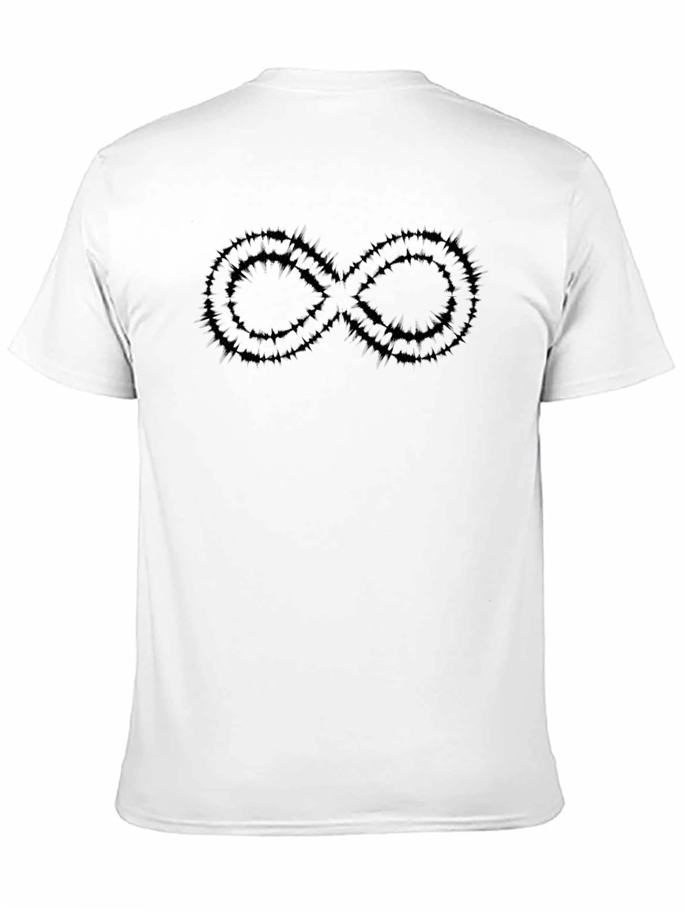 Make a statement with this striking black t-shirt. The design features a unique infinity symbol made of jagged lines, adding an edgy and modern twist to a classic symbol. The shirt appears to be made from a comfortable, breathable material, perfect for everyday wear. The design is simple yet eye-catching, making it versatile enough to pair with jeans, shorts, or even dress pants. This t-shirt is ideal for those who want to express their individuality with a subtle, yet impactful design. A must-have addition to any wardrobe for a touch of unique style.