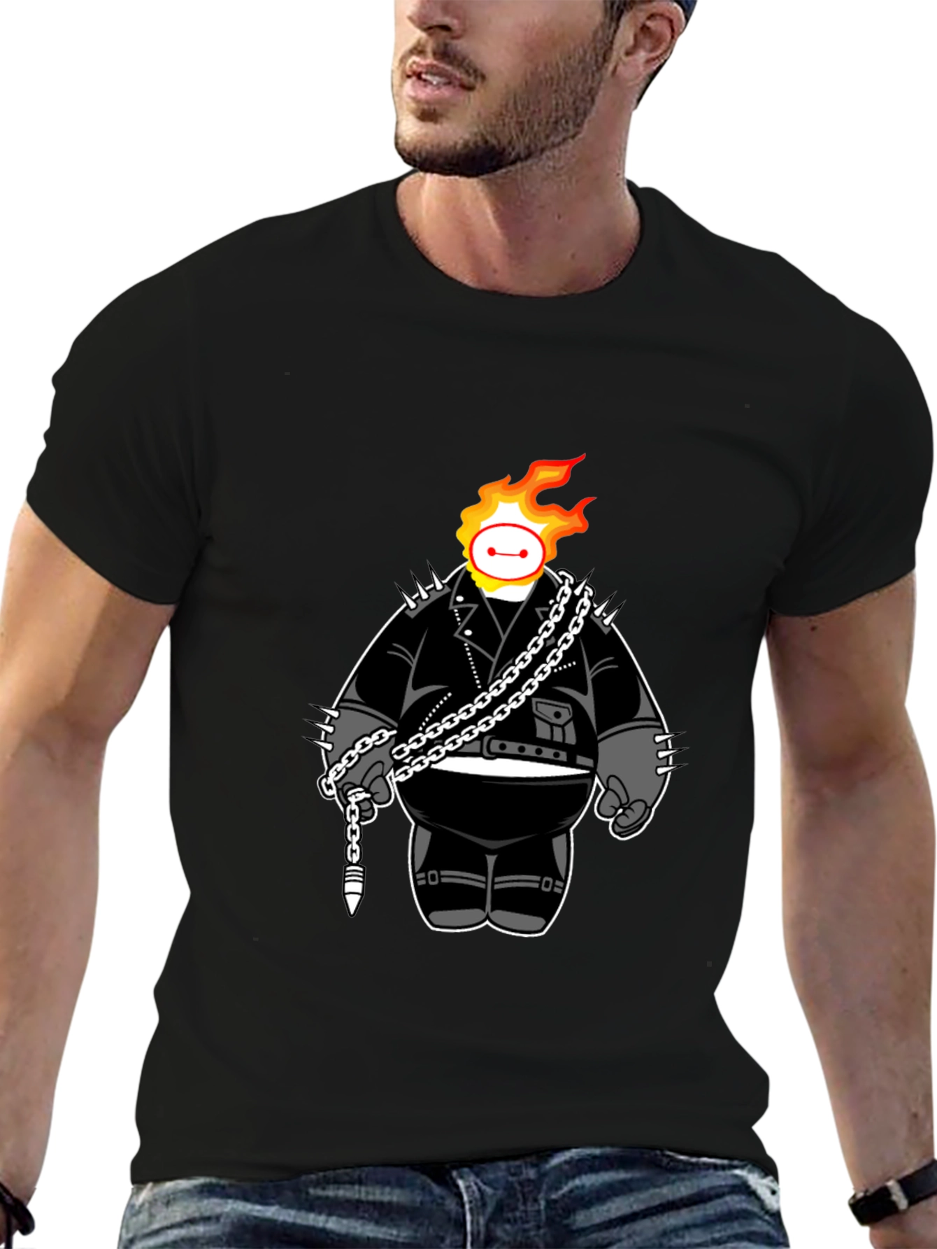 Unleash your inner rebel with this striking black t-shirt. Featuring a unique graphic of Baymax with a fiery twist, this tee is sure to turn heads. The bold design showcases Baymax in a biker-inspired leather jacket, complete with chains and spikes, adding an edgy vibe to the beloved character. Made from comfortable, breathable fabric, this shirt is perfect for casual outings, concerts, or expressing your unique style. Stand out from the crowd with this eye-catching blend of pop culture and rebellious flair. Pair it with jeans or shorts for an effortlessly cool look.