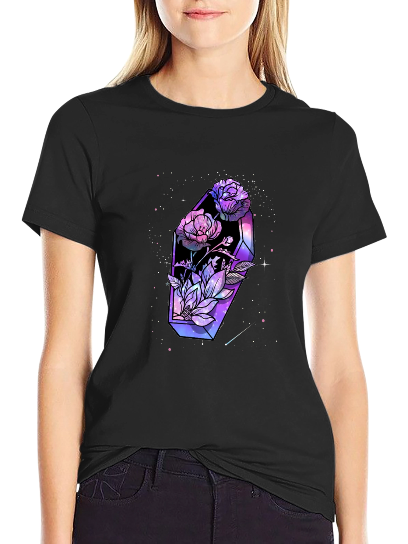 This black t-shirt features a vibrant and unique graphic design. The central element is a stylized coffin filled with colorful flowers and foliage. The coffin shape is outlined with eye-catching cosmic hues, creating a striking contrast against the dark background of the shirt. The design has stars and a shooting star in the background. Made from a soft and comfortable fabric, this tee is perfect for casual wear or making a statement. Ideal for those who appreciate alternative fashion, floral motifs, and eye-catching artwork. A definite conversation starter!