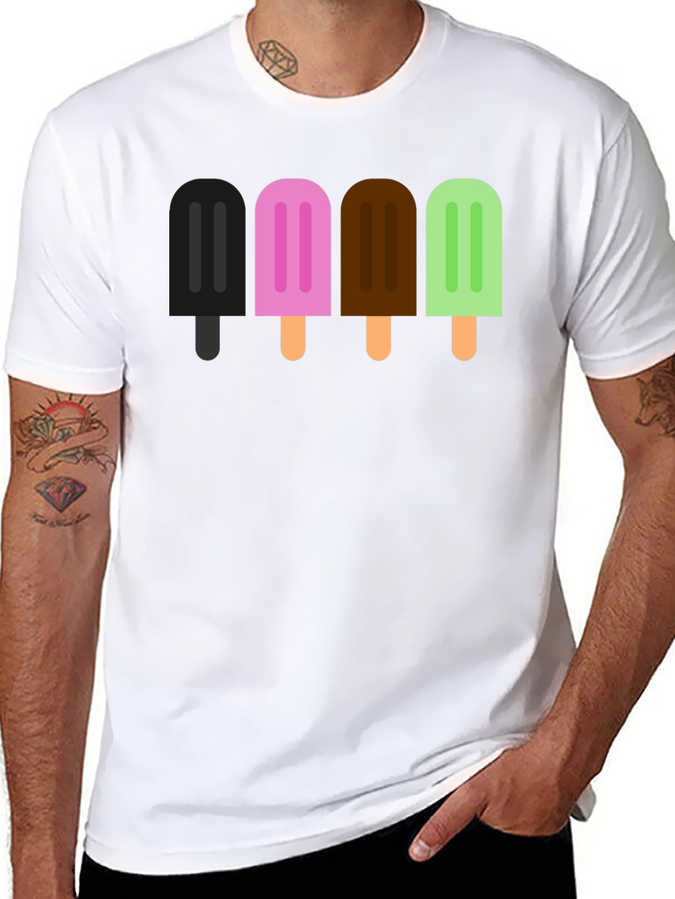 Show off your sweet side with this fun and stylish t-shirt. Featuring a vibrant row of popsicles in playful colors, this tee adds a pop of personality to any outfit. Made from a comfortable black fabric, it's perfect for everyday wear. The eye-catching design is sure to spark conversations and bring a smile to everyone's face. Pair it with jeans for a casual look or dress it up with a skirt for a bolder statement. This tee is ideal for ice cream lovers, summer outings, or anyone who wants to add a playful twist to their wardrobe.