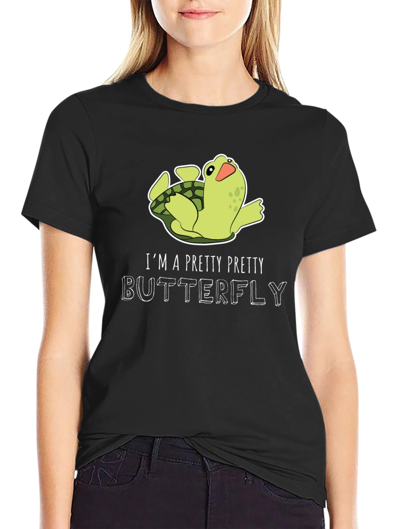 This black t-shirt features a humorous design with a cute green turtle lying on its back. Above the turtle, the phrase 'I'M A PRETTY PRETTY BUTTERFLY' is written in a playful, outlined font. The shirt appears to be made of comfortable cotton, perfect for casual wear. It’s a fun, lighthearted piece that adds a touch of whimsy to any outfit. Ideal for turtle lovers or anyone with a quirky sense of humor, this tee is sure to spark conversations and bring smiles. Wear it to the park, a casual get-together, or simply while lounging at home for a comfortable and amusing look.