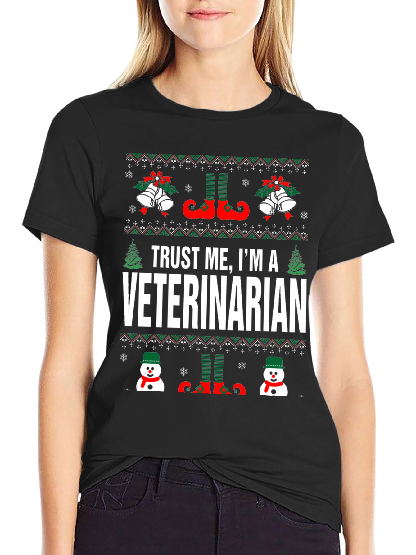 Get ready to celebrate the holidays in style with this eye-catching "Trust Me, I'm A Veterinarian" Ugly Christmas Sweater T-Shirt! Featuring a festive design with Christmas bells, elf shoes, trees, and cheerful snowmen, this shirt is perfect for any veterinarian with a sense of humor. The fun, ugly sweater-style print makes it an ideal choice for holiday parties, family gatherings, or just spreading some Christmas cheer. Made from comfortable, breathable fabric, it's sure to keep you cozy all season long. Show off your passion for animals and your festive spirit with this must-have Christmas T-shirt!