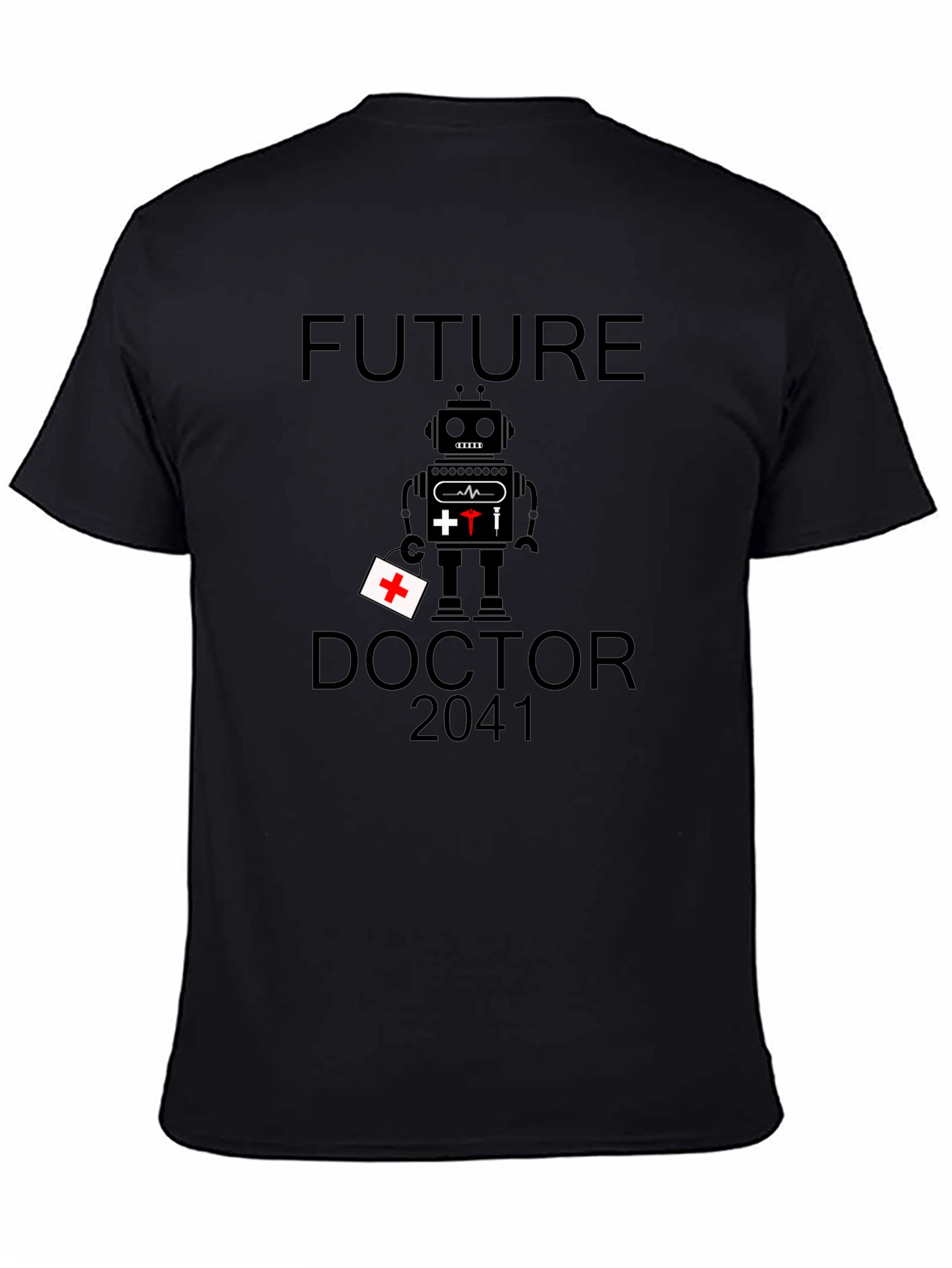 This black t-shirt features a creative design perfect for future medical professionals. It showcases a robot graphic with medical symbols like a pulse line and a first aid kit, accompanied by the text "FUTURE DOCTOR 2041." The design is unique and eye-catching, ideal for medical students, doctors, or anyone with an interest in healthcare. Made from comfortable material, it's suitable for everyday wear, casual outings, or as a fun conversation starter at medical conferences or school events. Get this fun tee for yourself or as a thoughtful gift.
