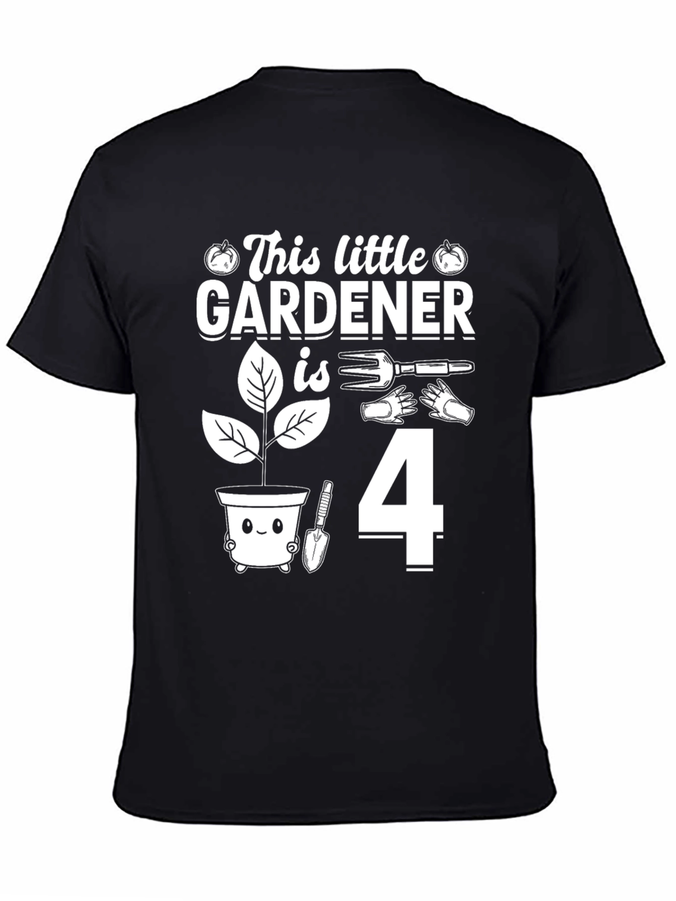 Celebrate your little one's 4th birthday with this adorable gardener themed t-shirt. The design features playful graphics including a smiling potted plant, gardening tools, and the number '4'. Made from a soft, comfortable fabric, this tee is perfect for your child's special day. The cute design is sure to be a hit with both kids and adults. This t-shirt is ideal for a birthday party or as a fun everyday outfit for your little gardener. Let them show off their love for gardening with this unique and charming shirt! Get ready to celebrate a 4th birthday full of fun and growth! Available in black color.