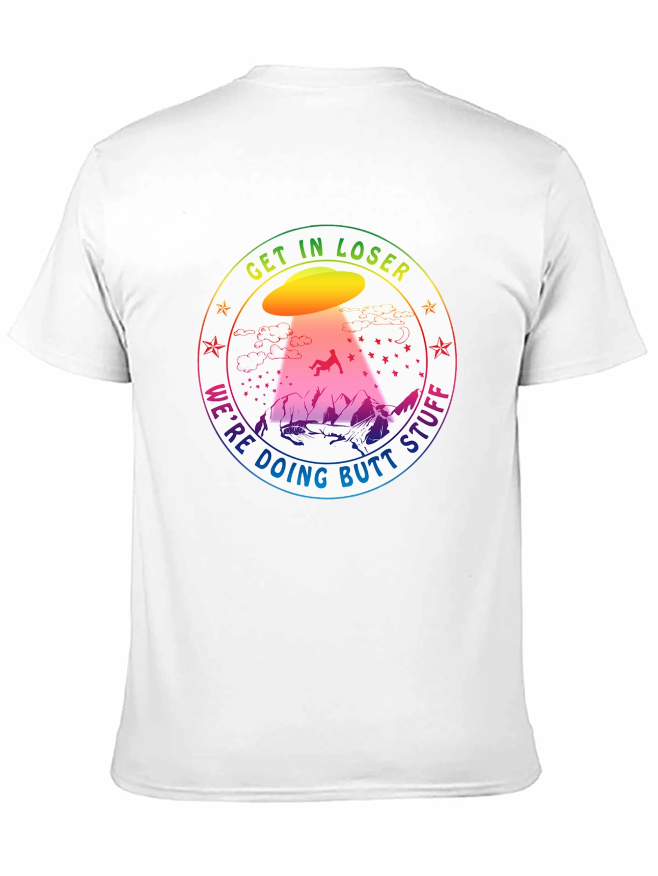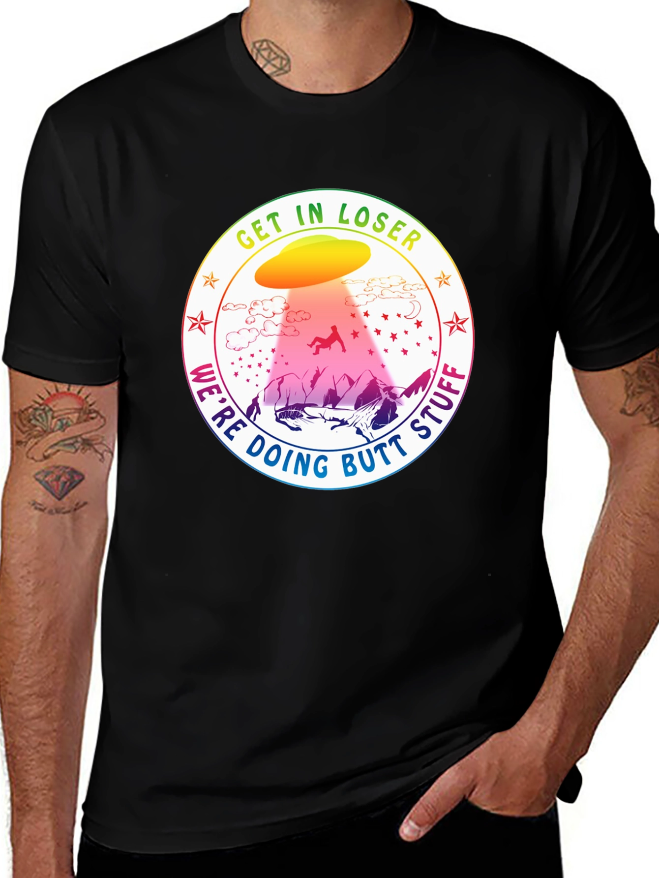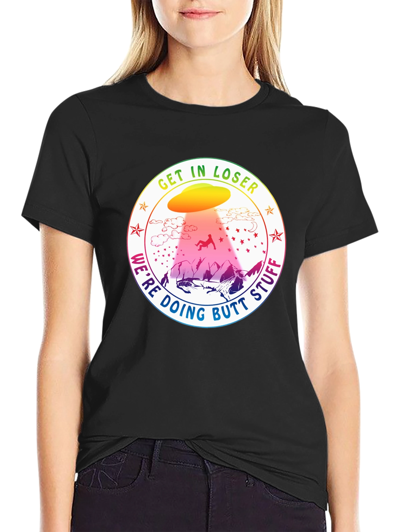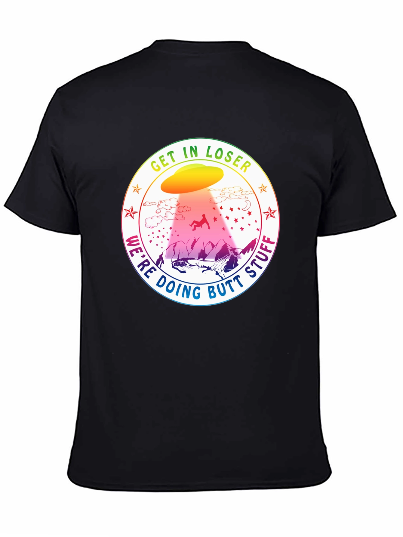 This black t-shirt features a humorous graphic design, ideal for those with a quirky sense of style. The design showcases a colorful UFO abducting a figure in a playful manner, surrounded by the phrase "Get In Loser, We're Doing Butt Stuff". Set against a mountain backdrop, the vibrant colors of the UFO and surrounding text pop against the dark background of the shirt. Made from comfortable, breathable fabric, this tee is perfect for casual wear, parties, or as a fun gift for friends and family. Embrace the humor and stand out with this unique statement piece.