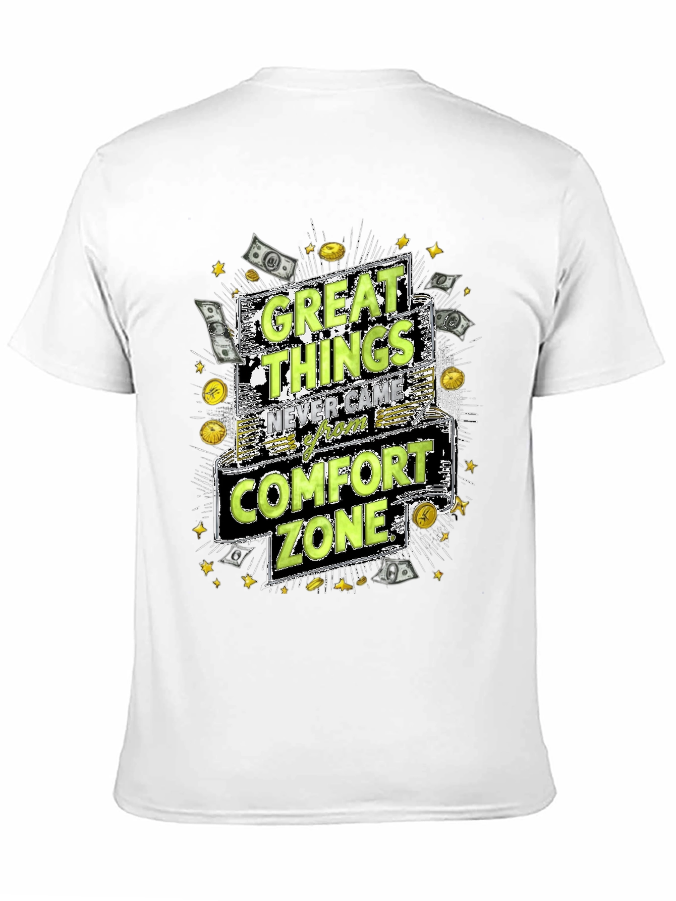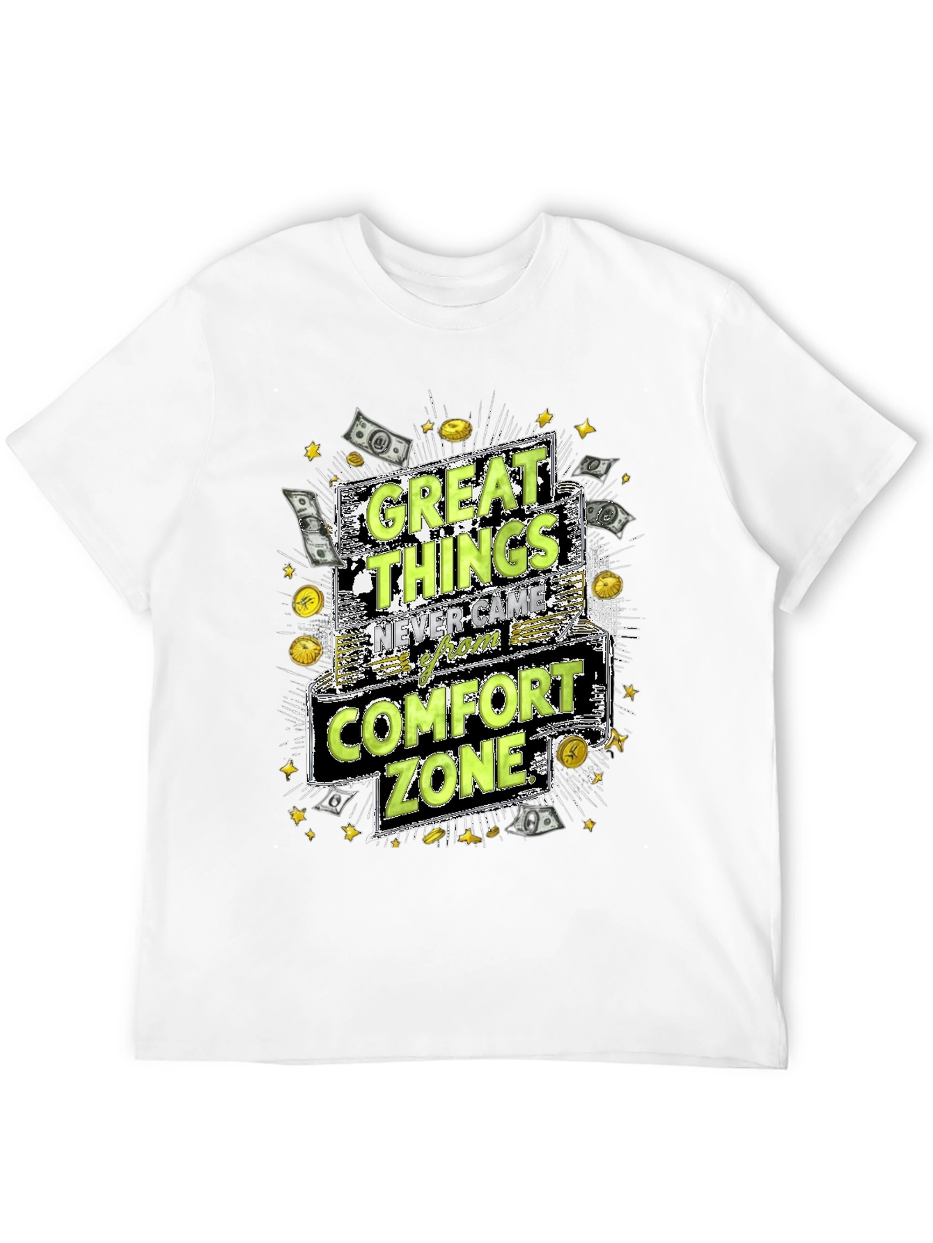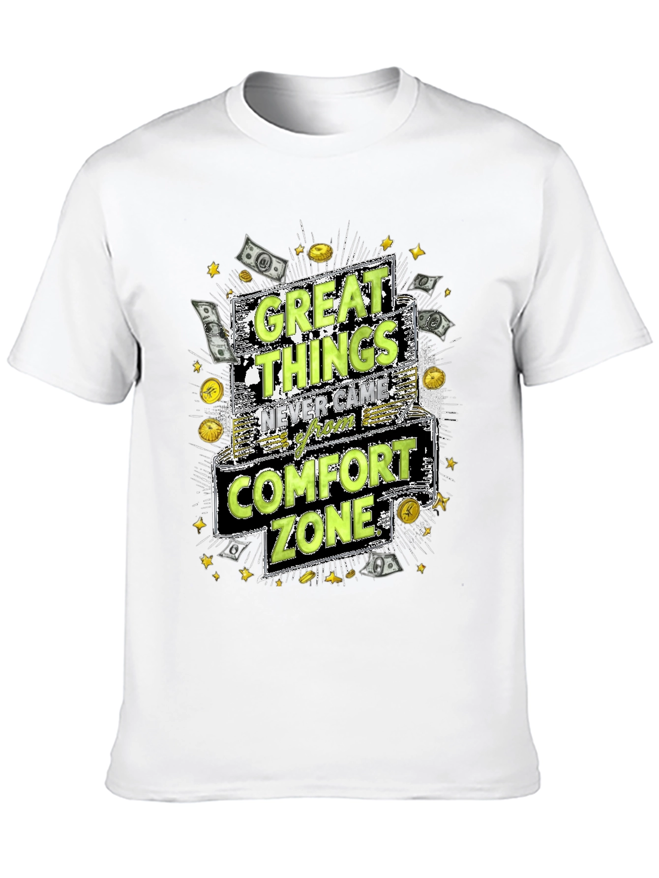 Step out in style with this bold graphic tee! This black t-shirt features the saying 'Great Things Never Came From Comfort Zone' in a striking, eye-catching design with money and star accents. Perfect for those who want to make a statement and inspire others to push their limits. Made from comfortable, breathable fabric, this tee is ideal for casual wear, workouts, or as a conversation starter. Show off your ambition and drive with this must-have wardrobe addition.