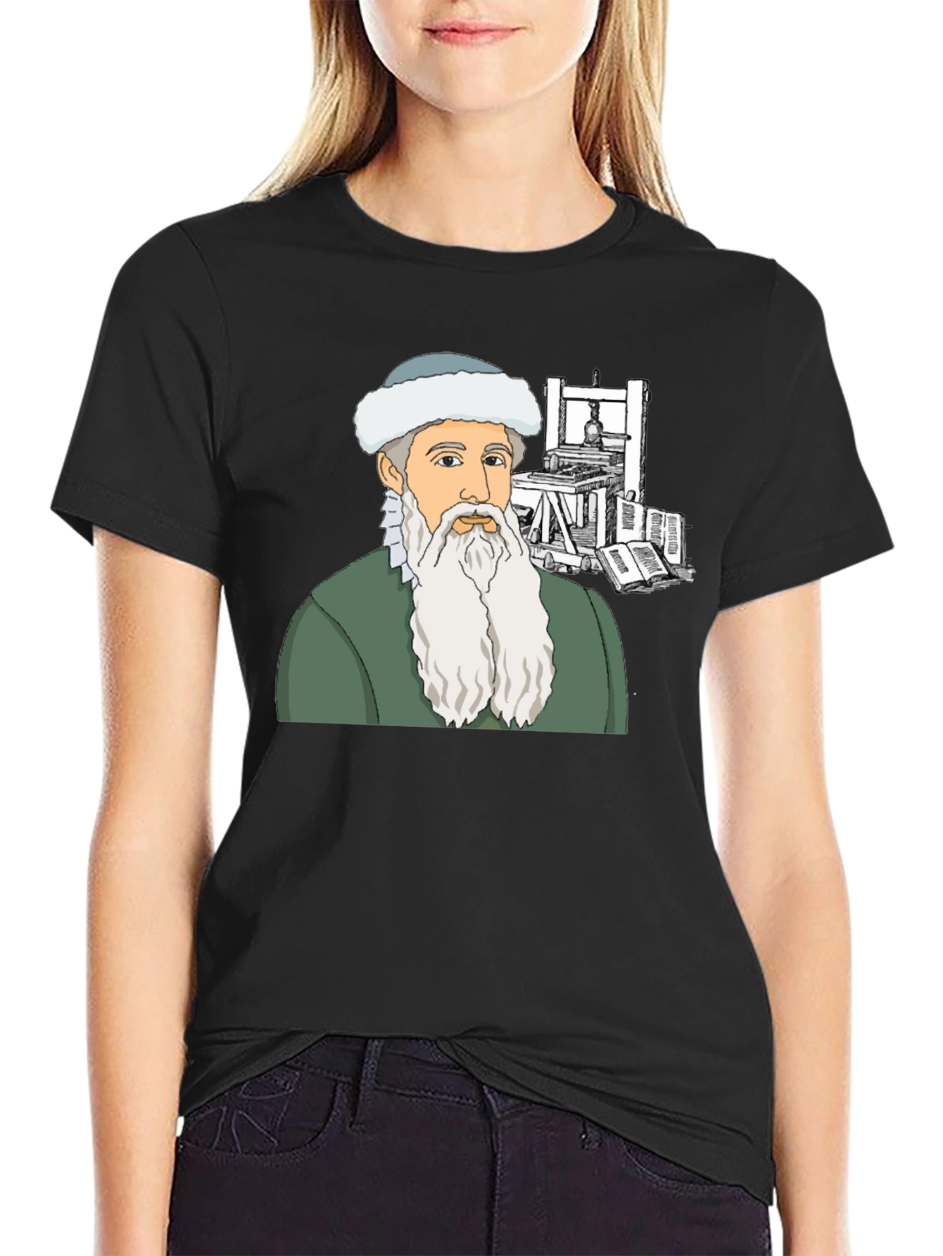 Show your love for history with this unique t-shirt! Featuring a detailed illustration of Johannes Gutenberg, his iconic printing press, and open books, this shirt is a conversation starter. Made from a comfortable, dark-colored fabric, it's perfect for everyday wear, historical reenactments, or book lovers' gatherings. The design is crisp and detailed, making it an eye-catching piece for those who appreciate the history of printing. Wear your passion for knowledge and innovation with this classic tee.