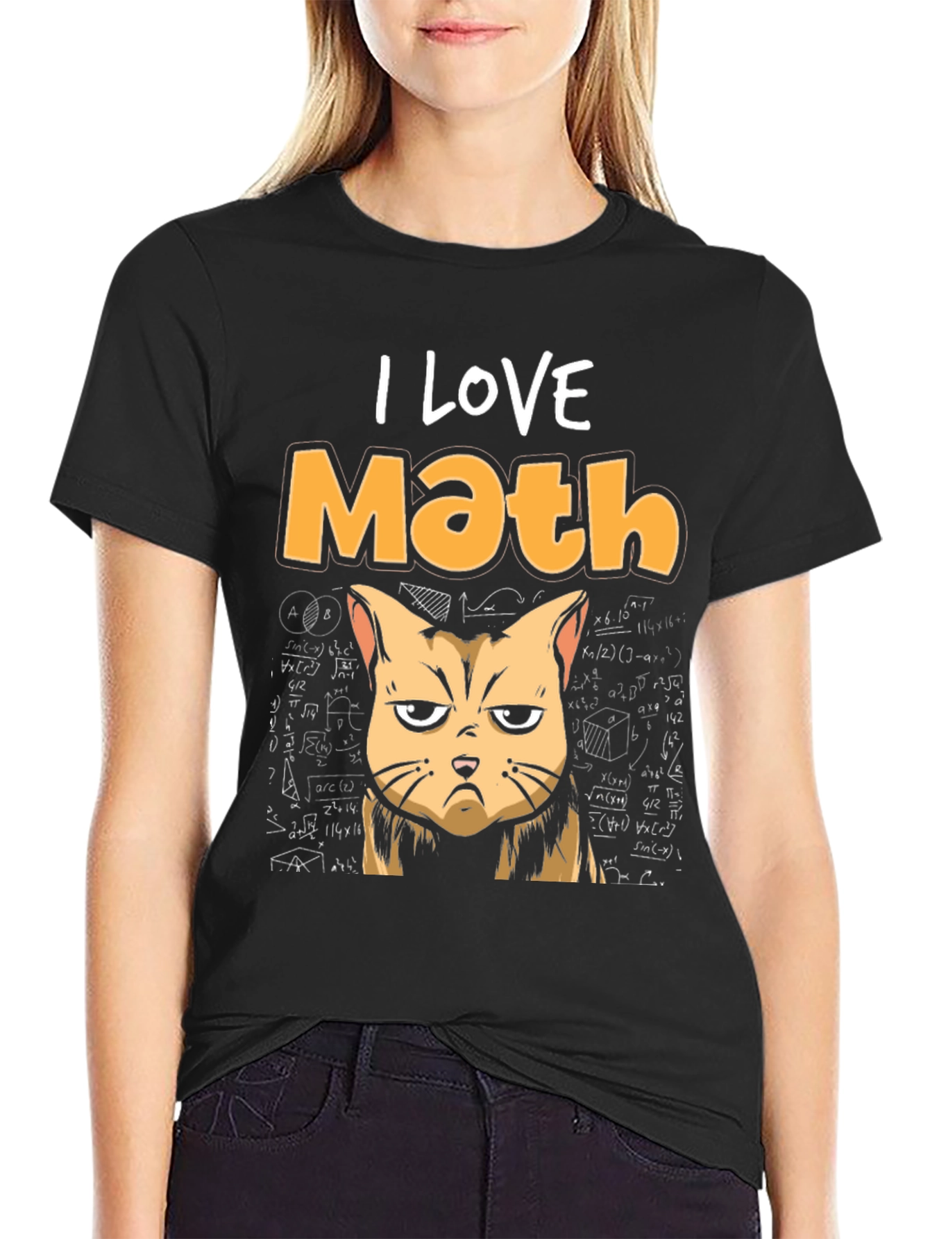 Show off your love for math with this unique t-shirt. This black tee features the phrase "I Love Math" in a bold, orange font, paired with an amusing graphic of a grumpy cat. The background is filled with mathematical equations and diagrams, adding a playful, nerdy twist. Made from a comfortable-looking fabric, it's perfect for everyday wear, math classes, or casual outings. Grab one for yourself or give it as a gift to your favorite math enthusiast.