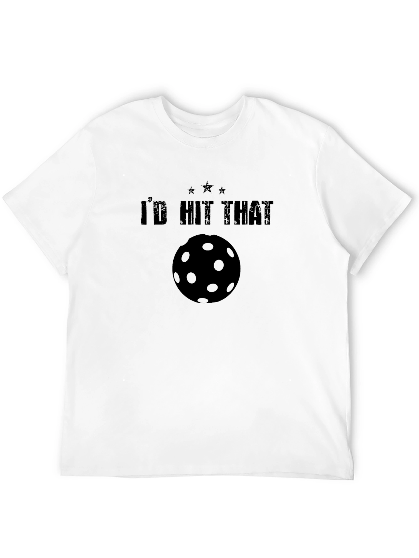 Show off your love for pickleball with this bold and fun t-shirt! Made from a comfortable, likely cotton blend, this black tee features the humorous statement "I'D HIT THAT" above a classic pickleball design. The distressed text and ball graphics give it a cool, vintage look. Ideal for wearing to the court, casual outings, or pickleball tournaments, this shirt is sure to be a conversation starter and a must-have for any pickleball enthusiast. Let everyone know you're ready to play with this eye-catching t-shirt!