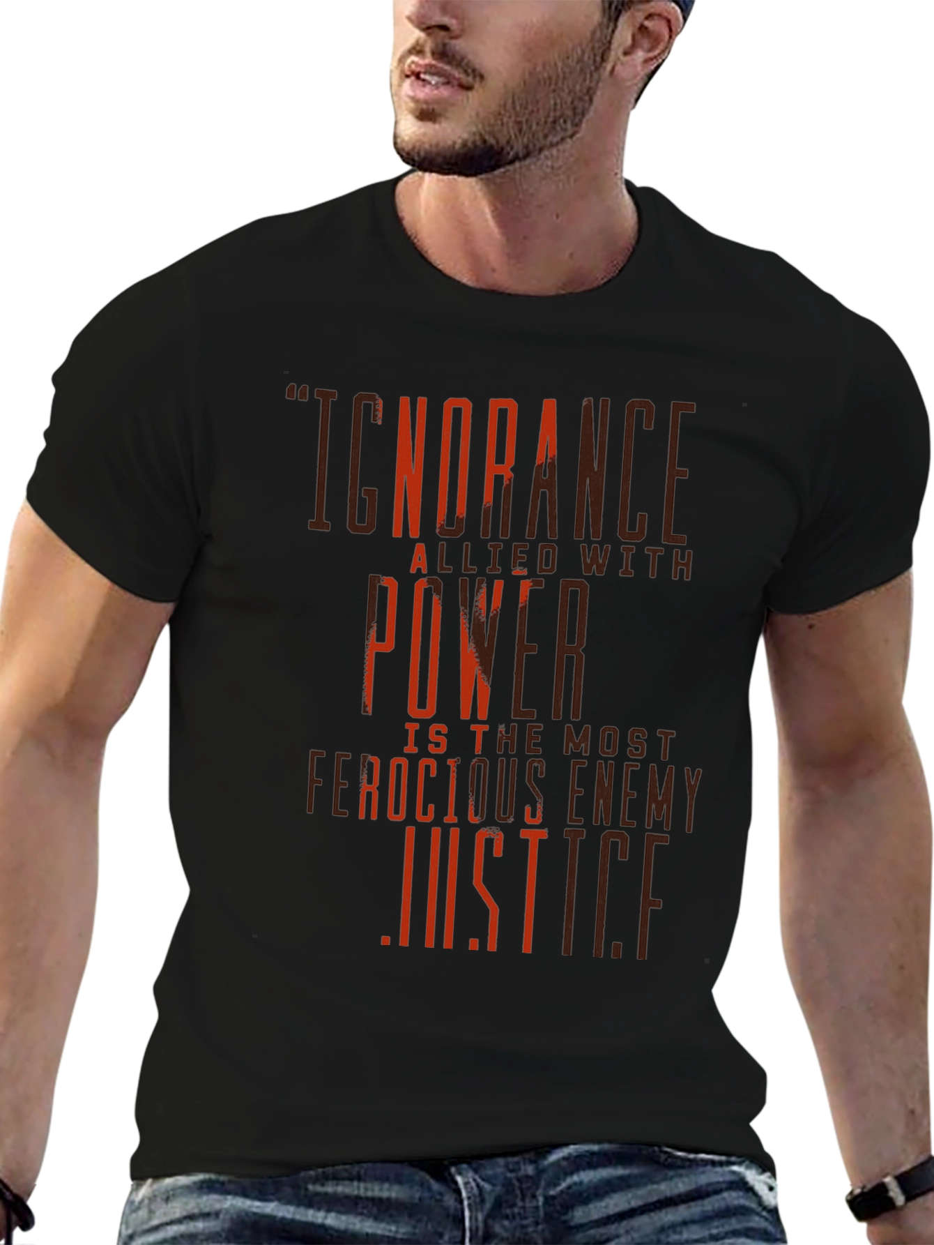 Make a bold statement with this black graphic t-shirt. The design features impactful red text that reads: "Ignorance Allied With Power Is The Most Ferocious Enemy of Justice". Made from a comfortable-looking material, this t-shirt is perfect for expressing your views or making a unique fashion statement. It is a standard short sleeve style with a relaxed fit. Wear it casually with jeans, or dress it up with a blazer. Great for everyday wear, protests, or social gatherings. Express yourself with this thought-provoking tee!