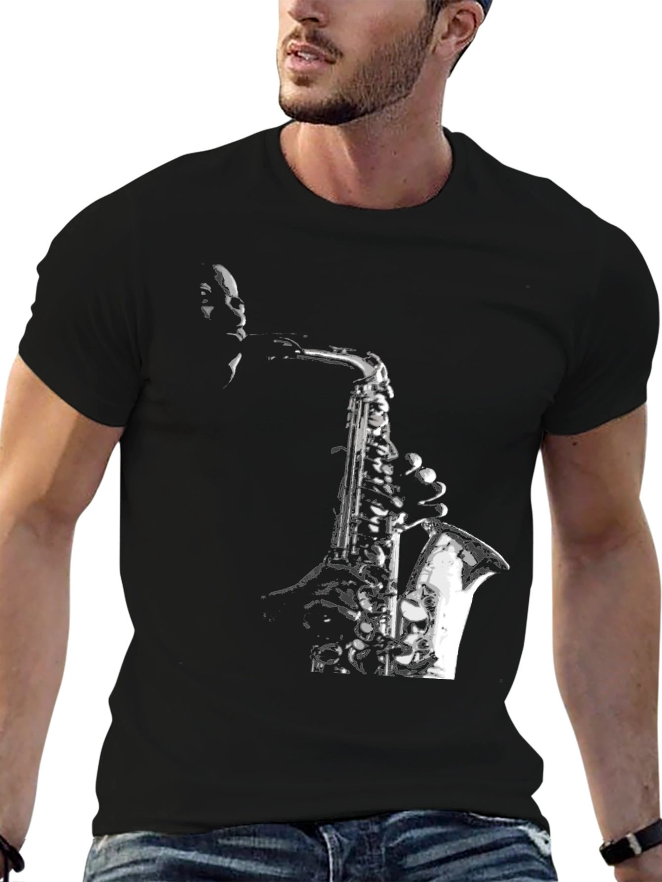Elevate your style with this striking black T-shirt featuring a high-contrast graphic print of a jazz musician playing the saxophone. The design captures the soulful essence of jazz music, making it a perfect statement piece for music lovers and style enthusiasts alike. Crafted from a soft, comfortable fabric, this tee ensures a great fit and all-day comfort. The bold graphic stands out, making it ideal for casual outings, concerts, or simply expressing your passion for music. Pair it with jeans or shorts for a cool, effortless look. Add this unique T-shirt to your wardrobe and let your style sing!