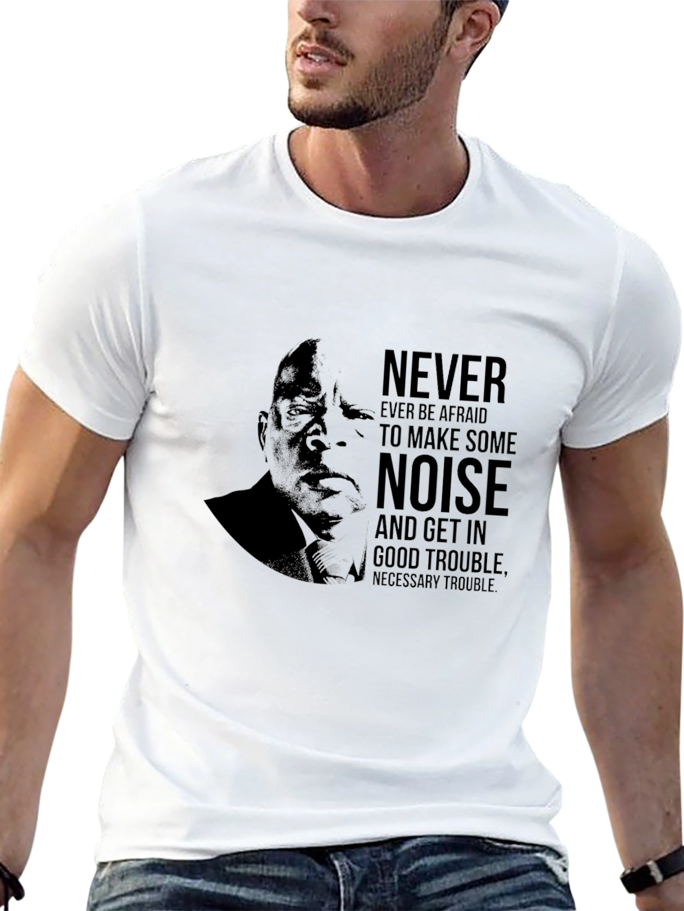 Show your support with this black t-shirt, featuring an image of John Lewis alongside his famous quote, "Never ever be afraid to make some noise and get in good trouble, necessary trouble." The design is printed on a soft, comfortable fabric, perfect for everyday wear. This t-shirt is an ideal way to express your values and inspire change. Wear it to rallies, events, or simply as a statement piece. Let the world know where you stand and honor the legacy of a civil rights icon with this inspiring and stylish t-shirt. A must-have for any activist or supporter.