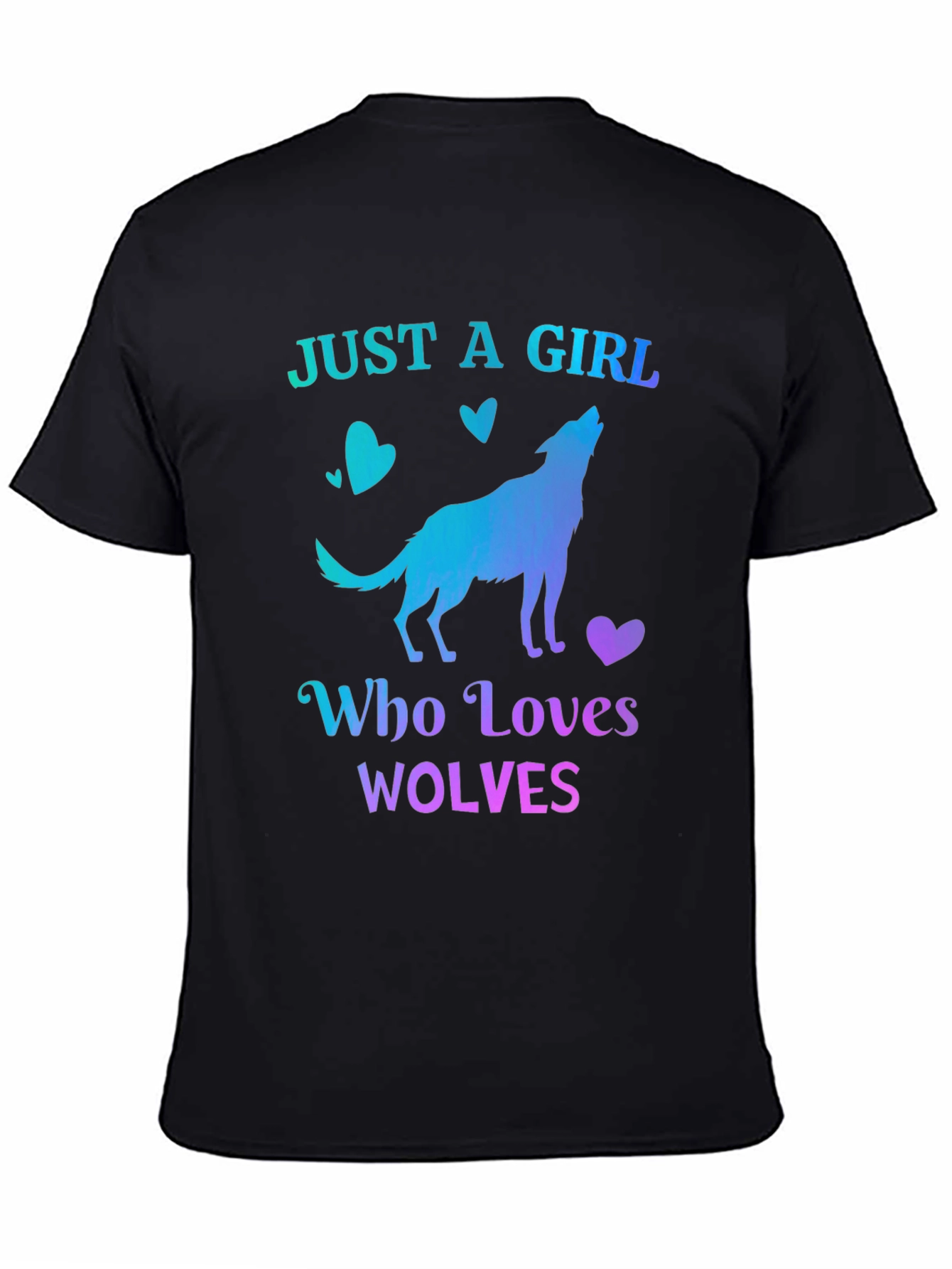 Showcase your love for wolves with this stylish black t-shirt. Featuring a unique design of a howling wolf silhouette with hearts, complemented by the text 'Just A Girl Who Loves Wolves' in an eye-catching teal to purple gradient. Made from a comfortable fabric, this tee is perfect for casual wear, animal lovers, or as a thoughtful gift. Express your passion and stand out with this cool and trendy graphic t-shirt.
