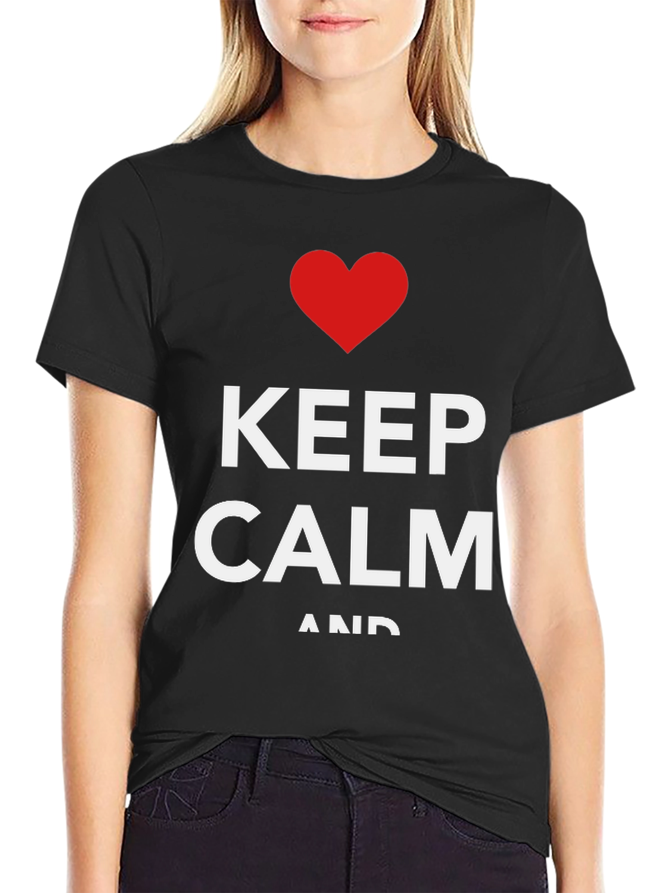 Stay cool and collected in this stylish black t-shirt. Made from a soft cotton blend, this tee features the iconic "Keep Calm" design with a heart replacing the crown. Perfect for casual wear, lounging at home, or making a statement. The classic fit and comfortable fabric make it a versatile addition to any wardrobe. Show off your positive attitude and relaxed style with this unique and eye-catching t-shirt. The bold white lettering pops against the black background, ensuring you'll stand out in a crowd.
