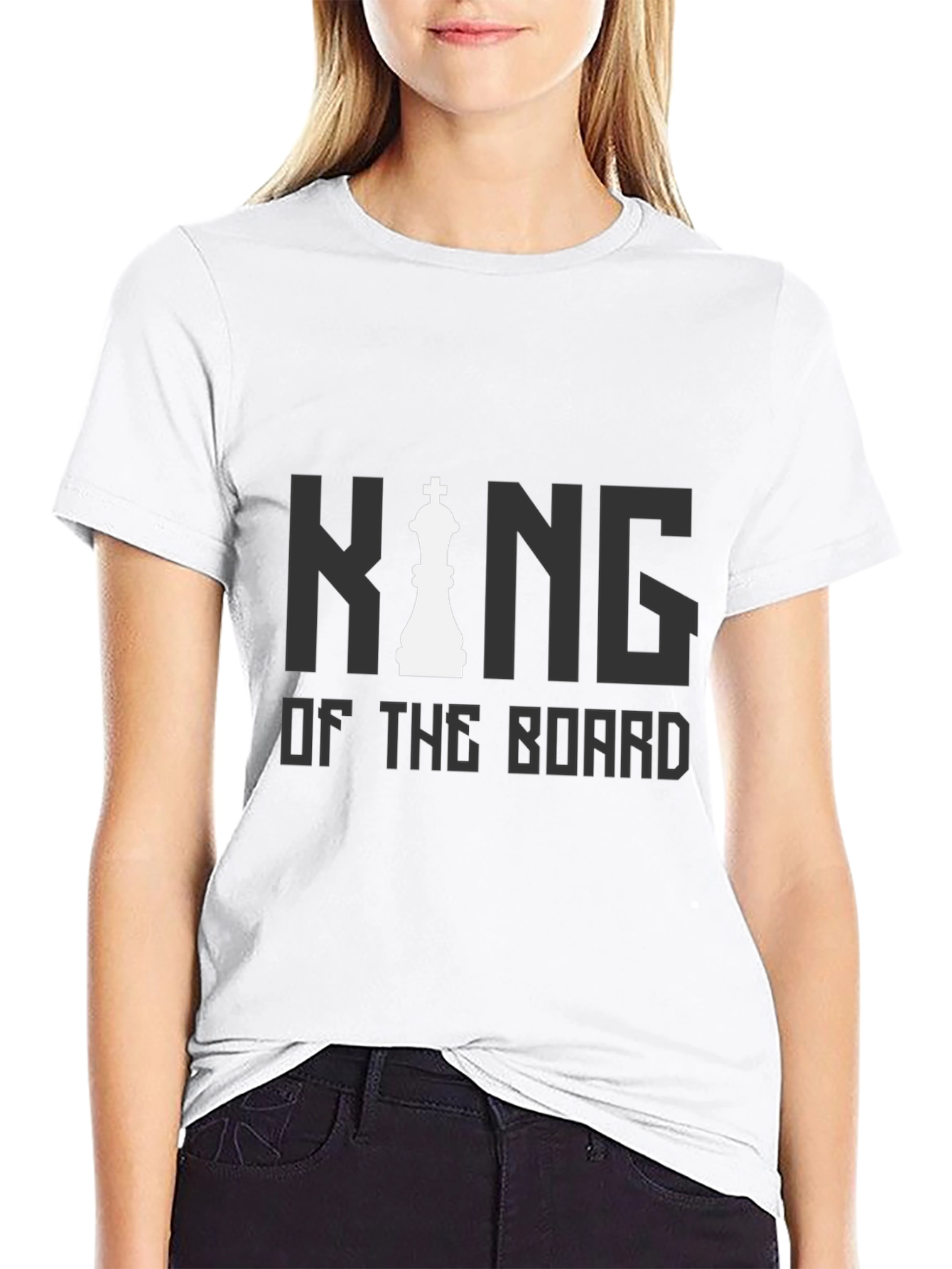 Dominate the chessboard in style with this bold black t-shirt. Featuring a striking graphic of a white chess king icon integrated with the text "KING OF THE BOARD" in gray. This design is perfect for chess enthusiasts who want to make a statement. The shirt appears to be made of a comfortable and breathable material, perfect for casual wear or intense matches. Show off your strategic prowess and command attention with this unique and eye-catching tee. Ideal for chess clubs, tournaments, or everyday wear, this t-shirt will let everyone know you're the king of the board.