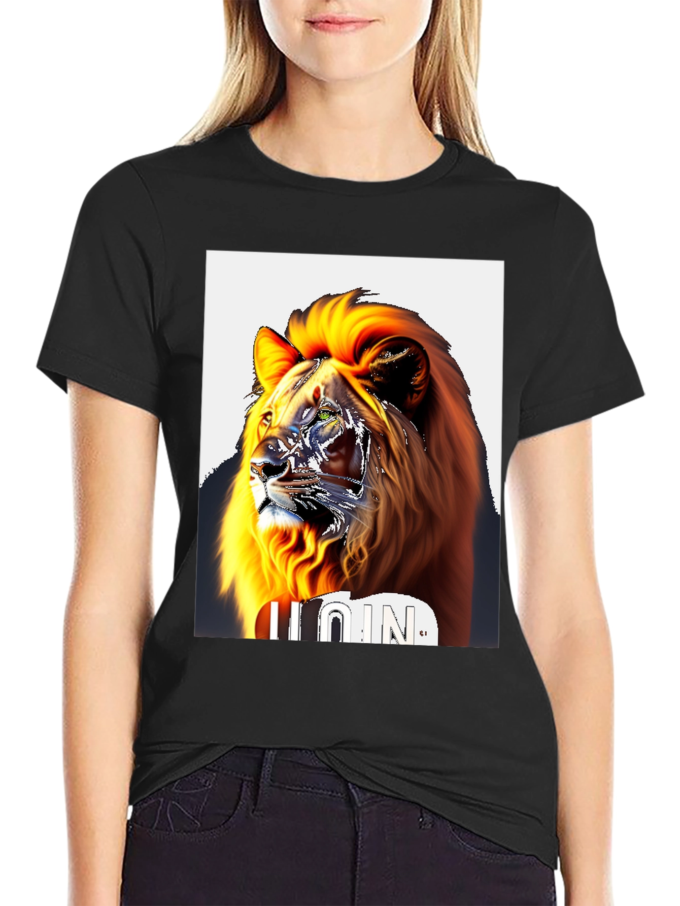 Make a bold statement with this striking black t-shirt featuring a vibrant lion graphic. The eye-catching design showcases a detailed lion's head with a fiery mane, creating a powerful and artistic look. Crafted from a comfortable, breathable fabric, this tee is perfect for everyday wear. Its classic fit ensures a relaxed and stylish silhouette, making it a versatile addition to any wardrobe. Ideal for casual outings, concerts, or expressing your unique personality. Pair it with jeans or shorts for an effortlessly cool ensemble. The bold design and comfortable fit make this t-shirt a must-have for those who want to stand out from the crowd.