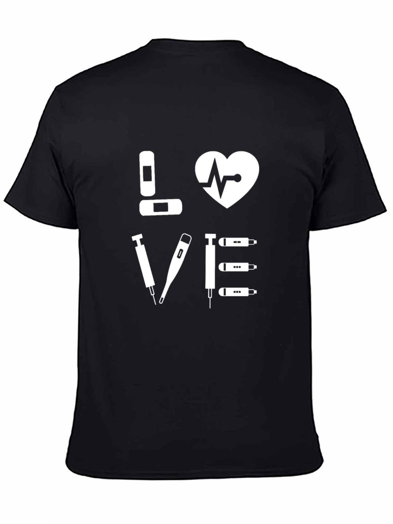 Show your passion for healthcare with this unique t-shirt. Featuring a creative design that spells out "LOVE" using medical symbols like bandages, a heart with an EKG line, syringes, and thermometers, this shirt is perfect for nurses, doctors, medical students, or anyone working in the medical field. The design is printed in white on a classic black tee. Soft and comfortable, this shirt is ideal for casual wear, work events, or as a thoughtful gift for a healthcare hero. Make a statement and spread the love for medicine with this eye-catching tee!