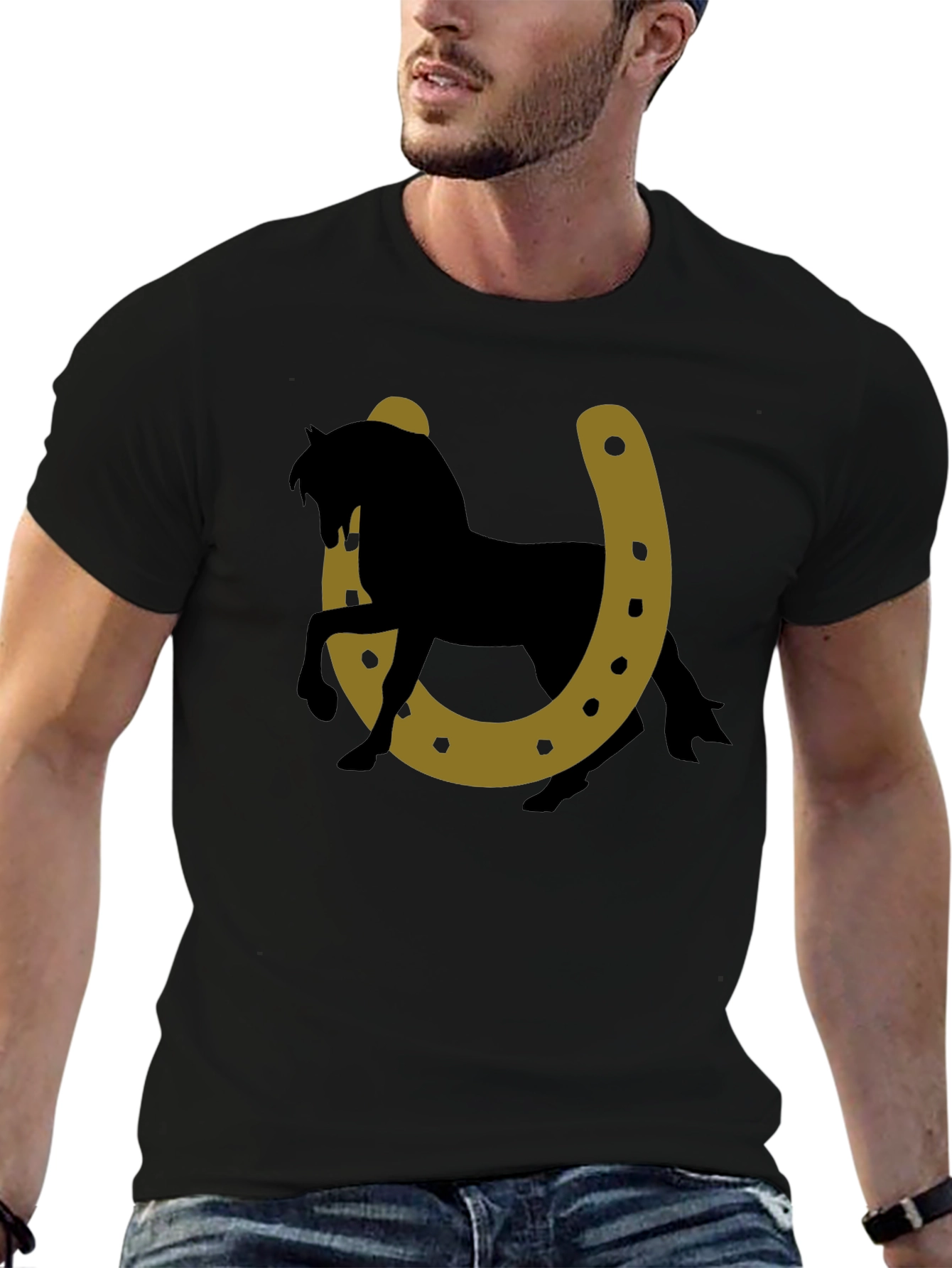 Show off your love for horses with this stylish graphic tee! Featuring a bold silhouette of a horse set against a golden horseshoe, this shirt is sure to catch the eye. The design is printed on a soft, black cotton tee, perfect for everyday wear. This tee is a great addition to any wardrobe. Wear it casually with jeans or dress it up with a jacket. It's also a thoughtful gift for the horse lover in your life! Get yours today and add a touch of equestrian charm to your style.