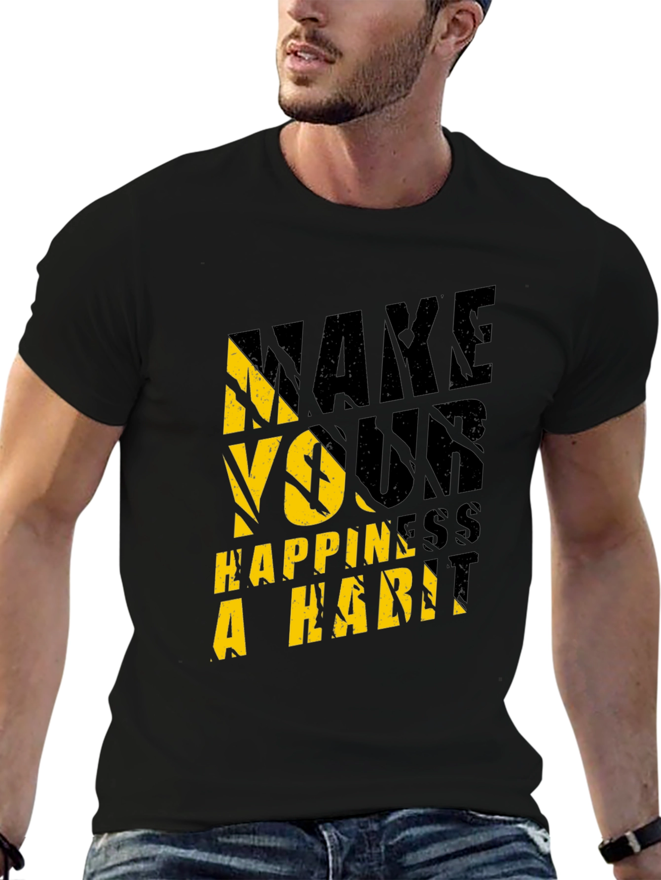 Embrace positivity with this stylish black graphic t-shirt. Featuring the inspiring message "Make Your Happiness A Habit" in a bold, eye-catching yellow and black design, this tee is perfect for everyday wear. The comfortable fit and soft fabric make it ideal for casual outings, gym sessions, or relaxing at home. Show off your optimistic attitude and inspire those around you with this must-have addition to your wardrobe. The unique design adds a touch of personality to any outfit, making it a great conversation starter. Wear your happiness!