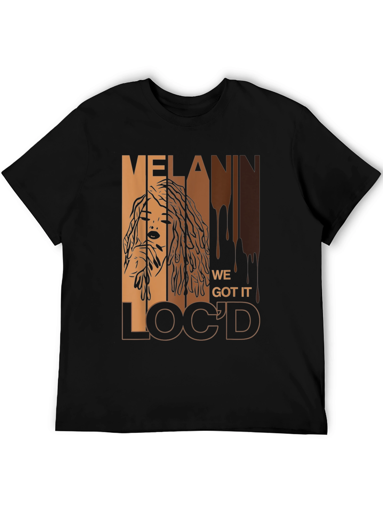 Showcase your pride with this stylish black t-shirt featuring a unique "Melanin We Got It Loc'd" design. The tee features an artistic depiction of a woman with locs, set against a background of varying shades of brown, symbolizing the spectrum of melanin. Made from comfortable, breathable fabric, this shirt is perfect for everyday wear or special events. It's a great way to express cultural identity and make a fashion statement. This shirt is more than just apparel; it's a celebration of beauty, strength, and pride. Add this eye-catching piece to your wardrobe today!