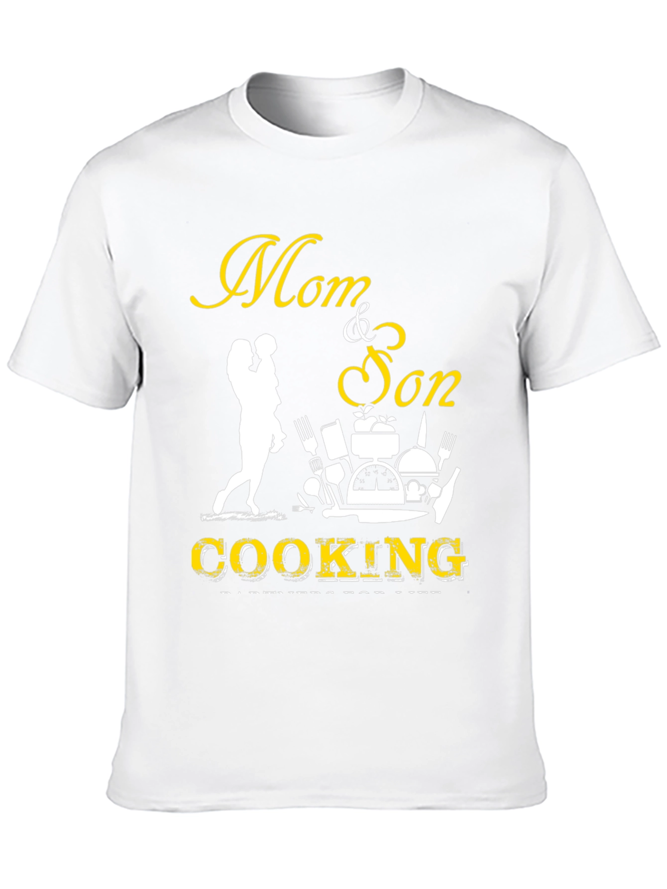 Showcase the special bond with this adorable black t-shirt featuring a "Mom & Son Cooking" design. This tee displays a silhouette of a mother holding her child, surrounded by various kitchen utensils. The design includes elegant yellow script for "Mom & Son" and bold text for "COOKING," emphasizing the theme of shared culinary adventures. Ideal for mothers who love to cook with their sons, this shirt is a fun and stylish way to express that connection. Perfect for casual wear, family gatherings, or as a thoughtful gift for a cooking enthusiast mom.