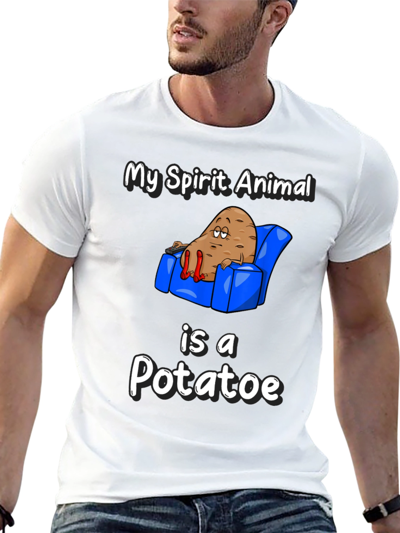 Show off your laid-back personality with this fun graphic tee! This black t-shirt features a cartoon potato character relaxing in a blue armchair while watching TV. The humorous design includes the text "My Spirit Animal is a Potato," making it a perfect conversation starter. Made from a comfortable fabric, this tee offers a relaxed fit ideal for everyday wear. Great for lounging at home, casual outings, or as a quirky gift for the potato-lover in your life. This unique t-shirt brings a touch of humor and style to any wardrobe.