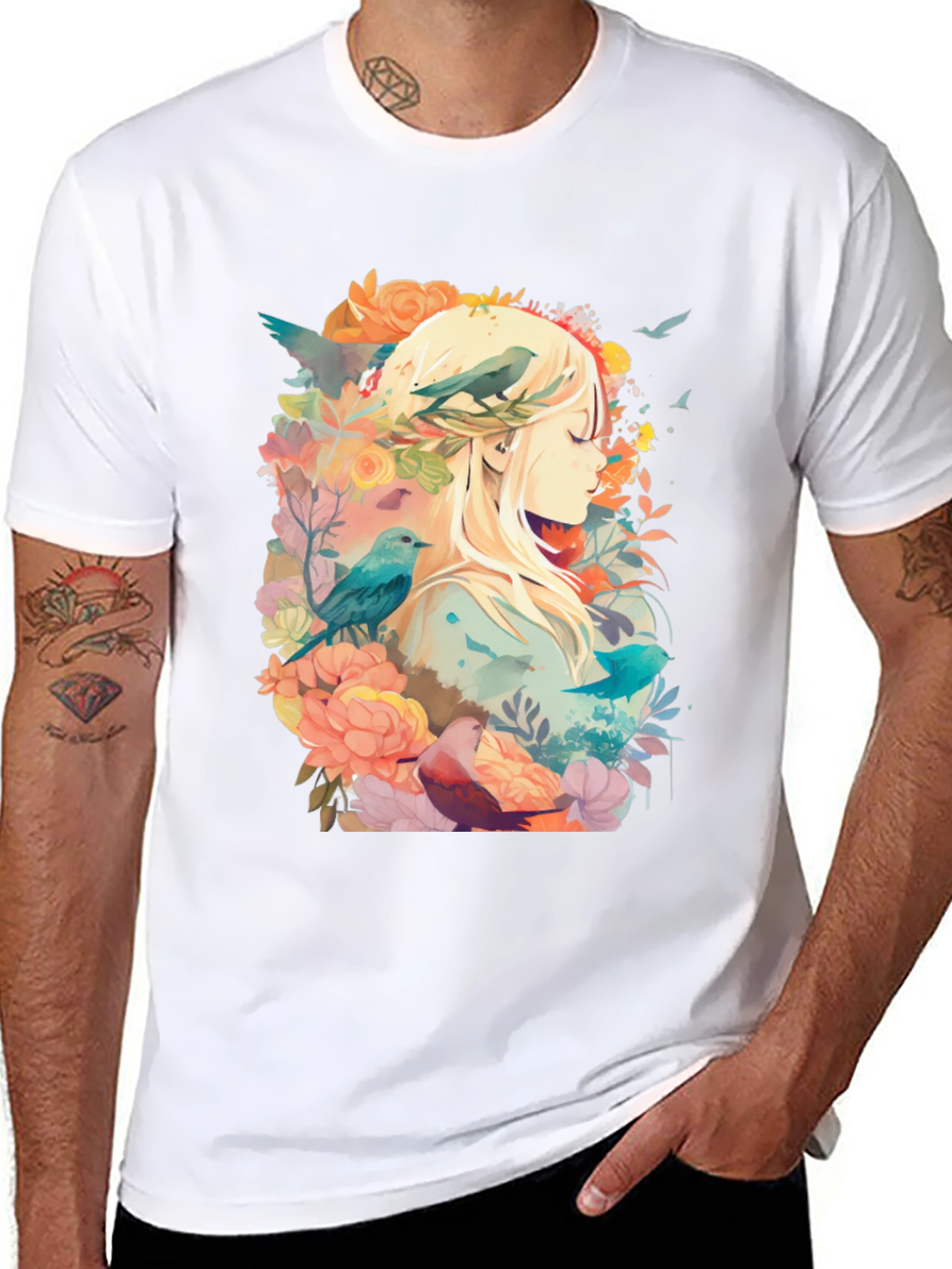 Showcase your love for nature with this unique graphic tee. The design features a serene woman surrounded by vibrant flowers and birds, creating a peaceful and stylish look. Made from comfortable, breathable fabric, this t-shirt is perfect for everyday wear. Pair it with jeans for a casual outing, or dress it up with a blazer for a more fashionable ensemble. The eye-catching print is sure to spark conversations and add a touch of artistic flair to your wardrobe. A must-have for nature enthusiasts and fashion-forward individuals alike. Get yours now and express your unique style!